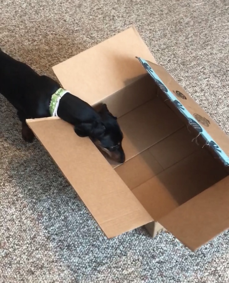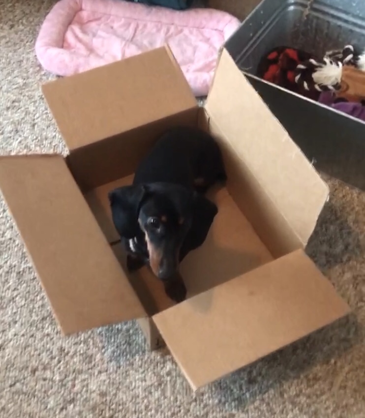 I tapped the center of the open box with my finger and repeated, “Jump in!”. She had first learned this trick over a year ago, and we haven’t really practiced it since then, but I didn’t think it was all that difficult for a brave, agile little Dachshund. SHE obviously thought I was wrong in that assumption.