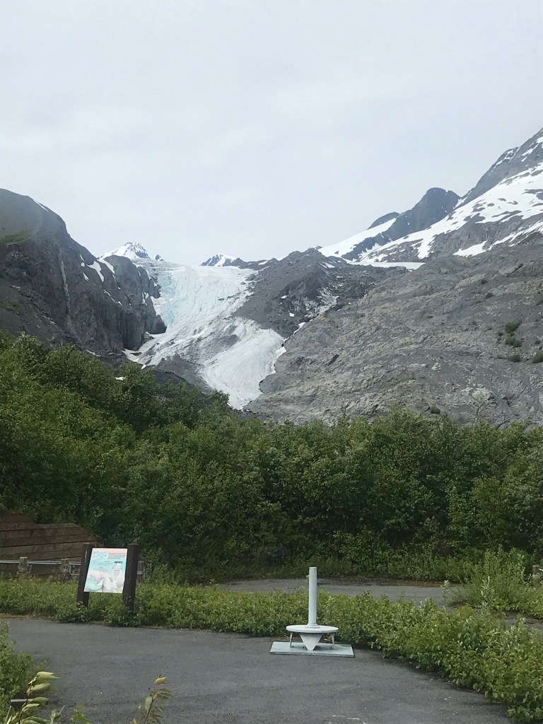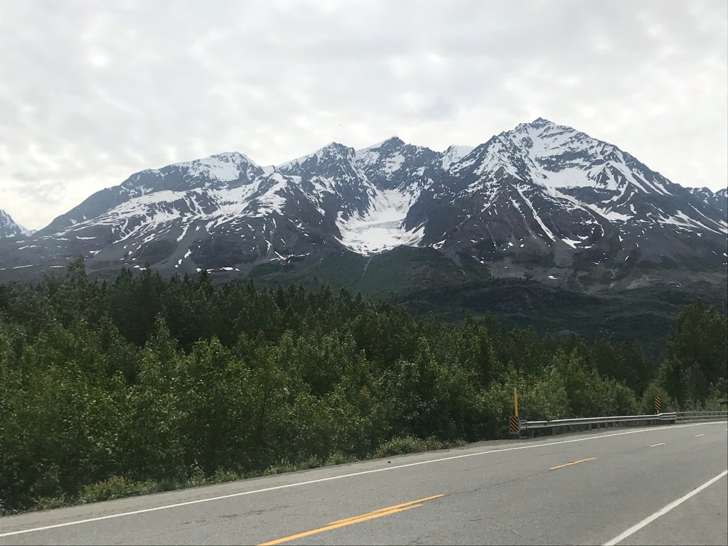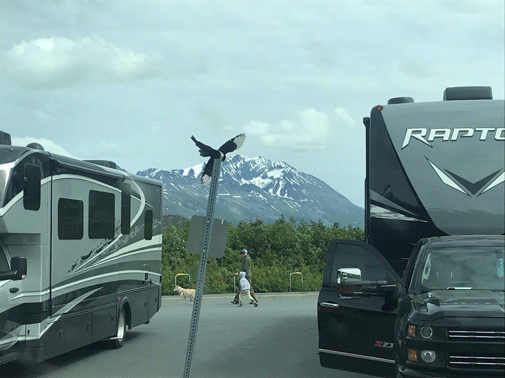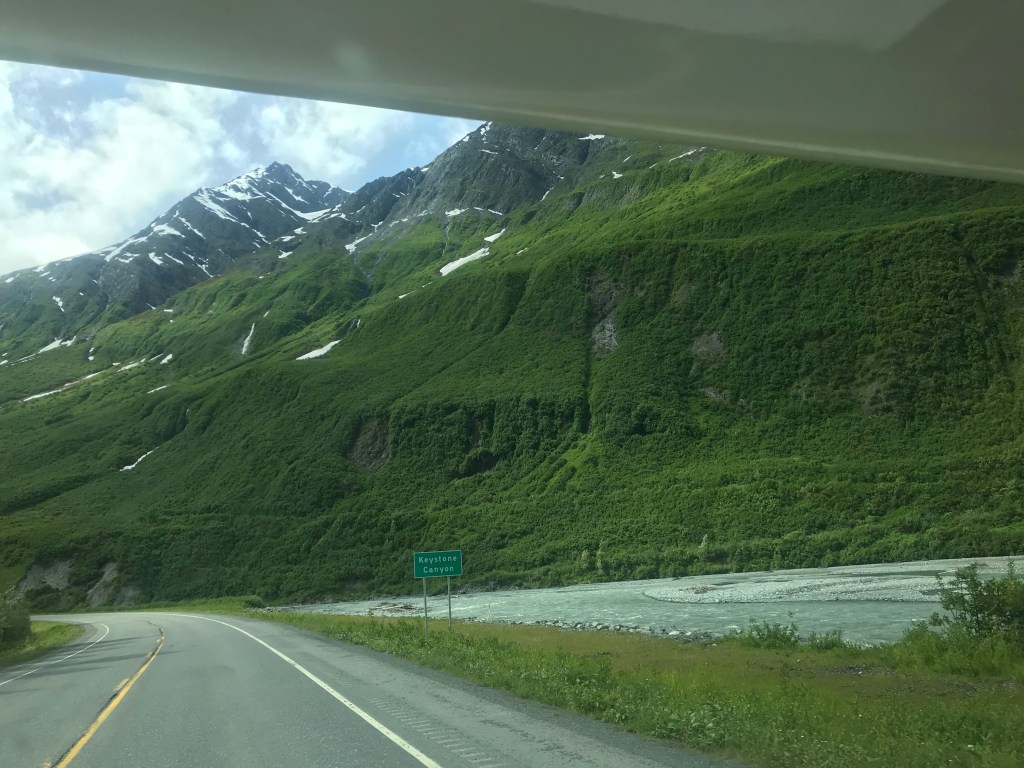 With dinner beckoning me from my favorite restaurant in Valdez (I opted for take-out), I didn’t stop to take photos at the always picturesque waterfalls, rivers and towering cliffs along Keystone Canyon. I did drive slowly though, and soaked up all the beauty I could stuff in without bursting. Oh! It was beautiful. 🌲🦅🌲