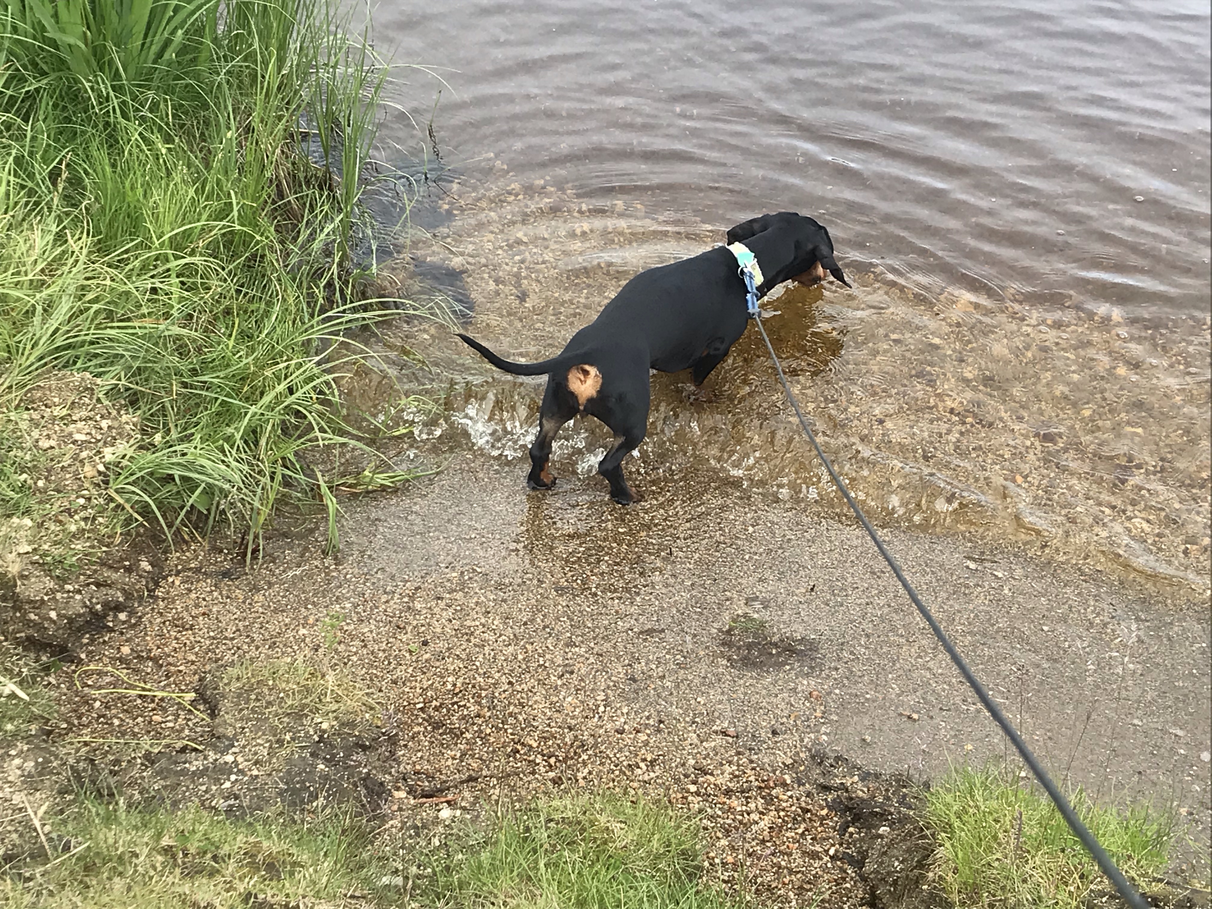 Still, a few gems were found along the way. Hidden Lake sported a lovely, well maintained roadside park where Ronni took great delight in checking out mini waves on an equally small “beach” – just the right size for a dachshund.
