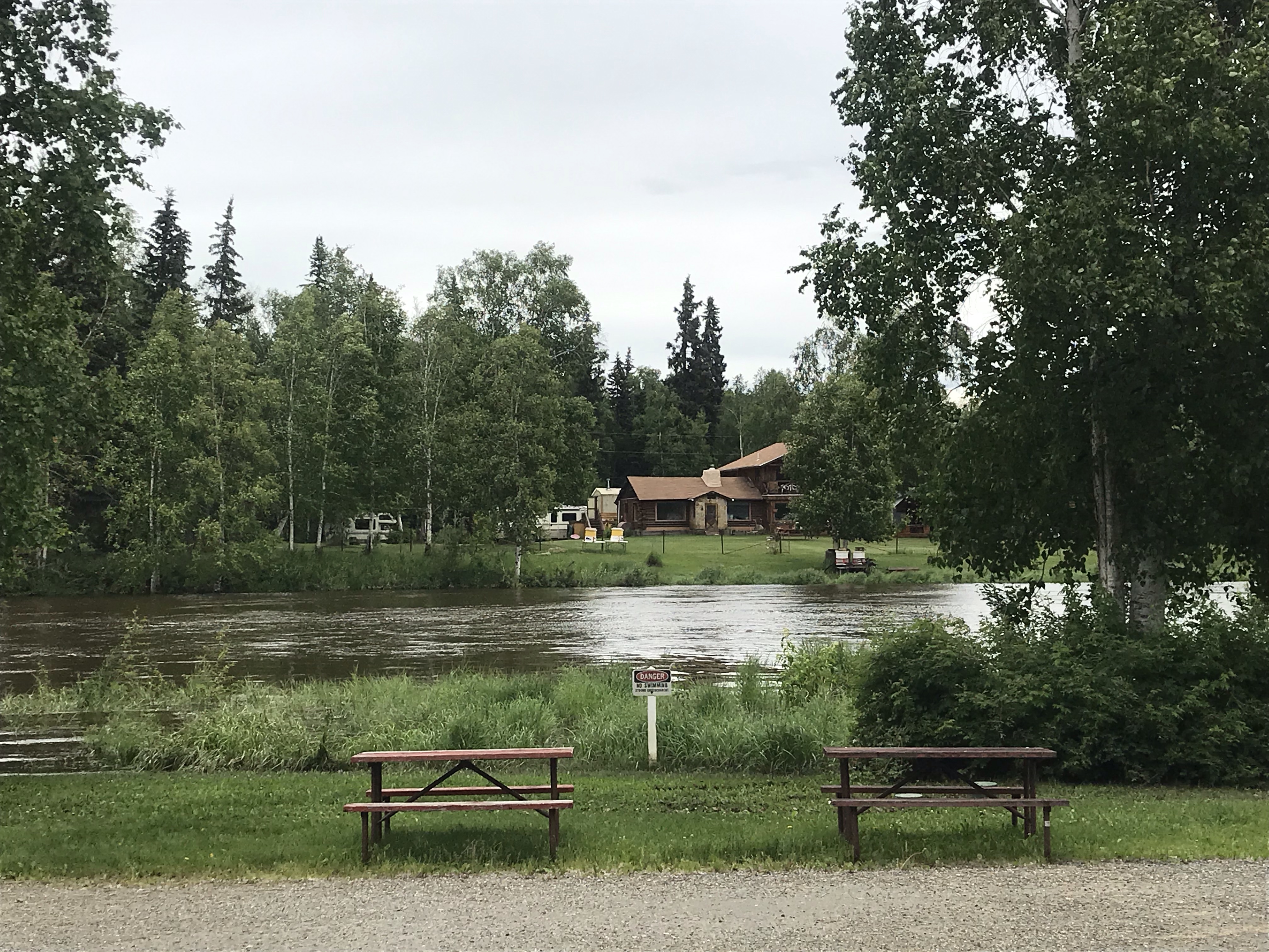 Our glorious sunshine of the previous two days was gone, replaced by leaden skies and loudly gusting winds. Enough wind, it seems, to be shaking spruce cones (Alaska’s version of pine cones) off all the trees surrounding our campsite.