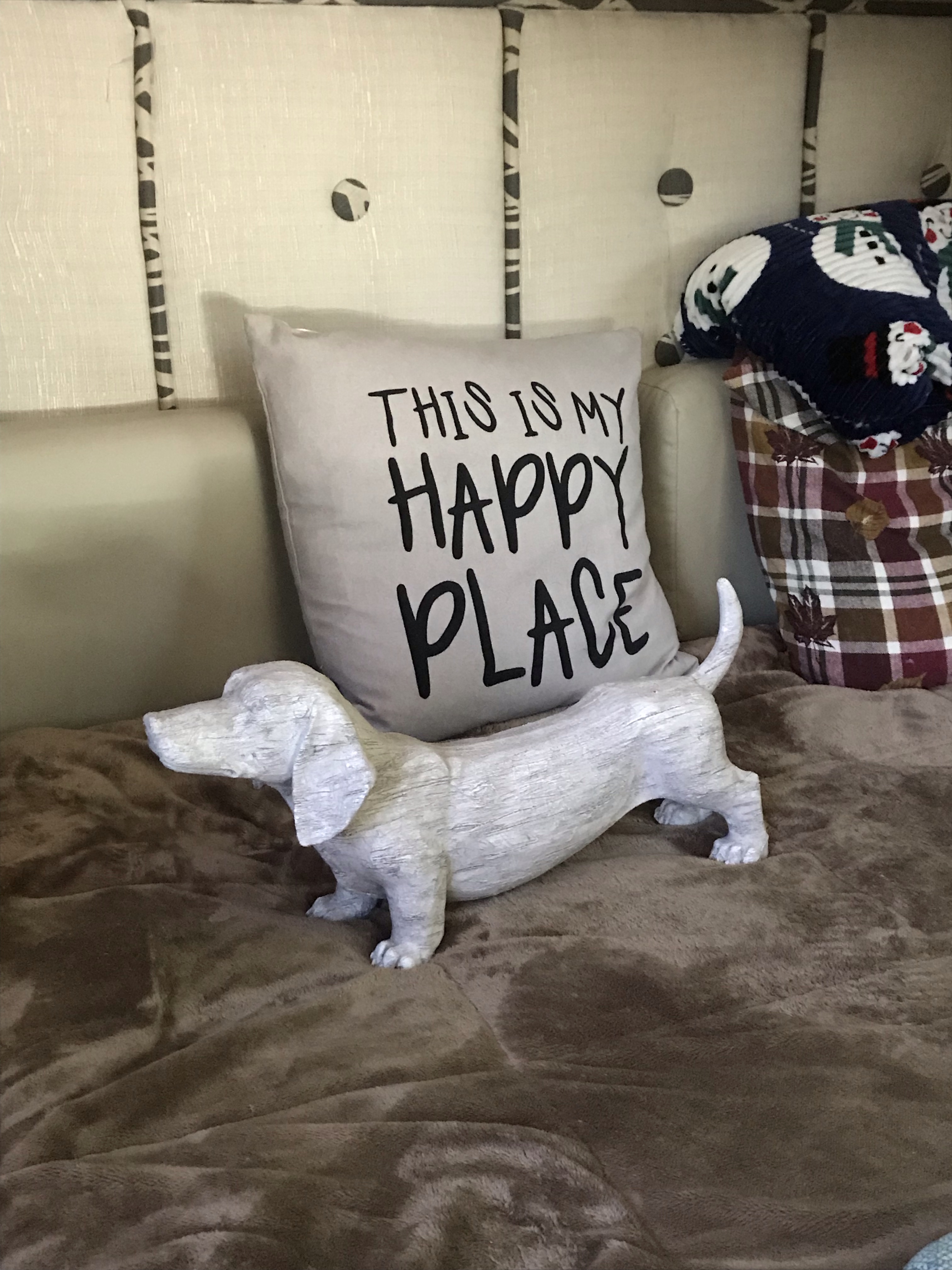 I’ll bring in the life-size dachshund statue that sits outside with the plants – “Phred” travels on the bed, cushioned by pillows. I’ll put away several other knick-knacks that only get brought out if I’m staying more than 24 hours …