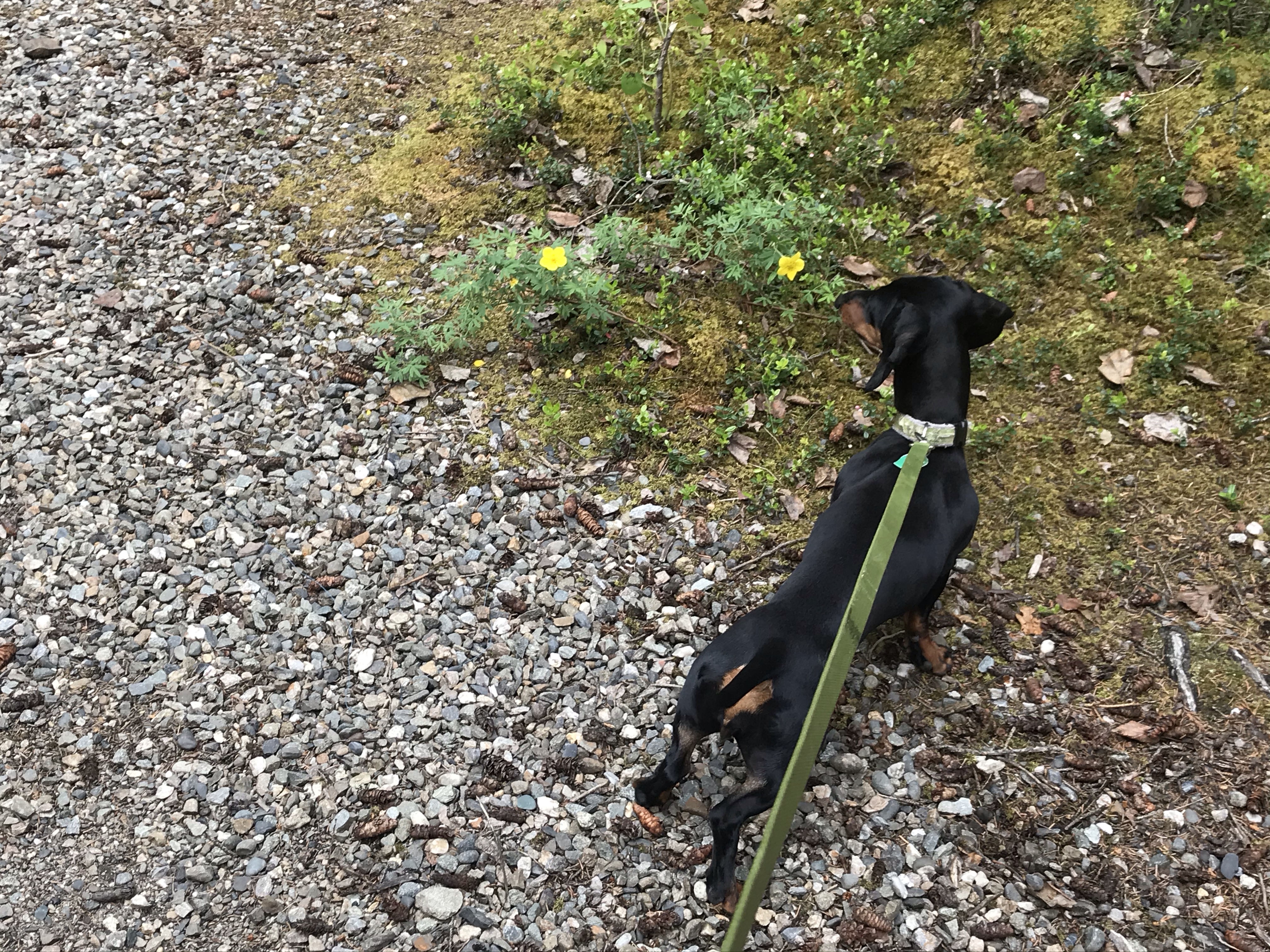 Rhonda started out the day in her usual position as substitute navigator (Baxter sat out this trip at home with Dad), but as often happens, she ended up sleeping on the job. Except when I pulled off the road for a potty break – then she was all ears and tails!