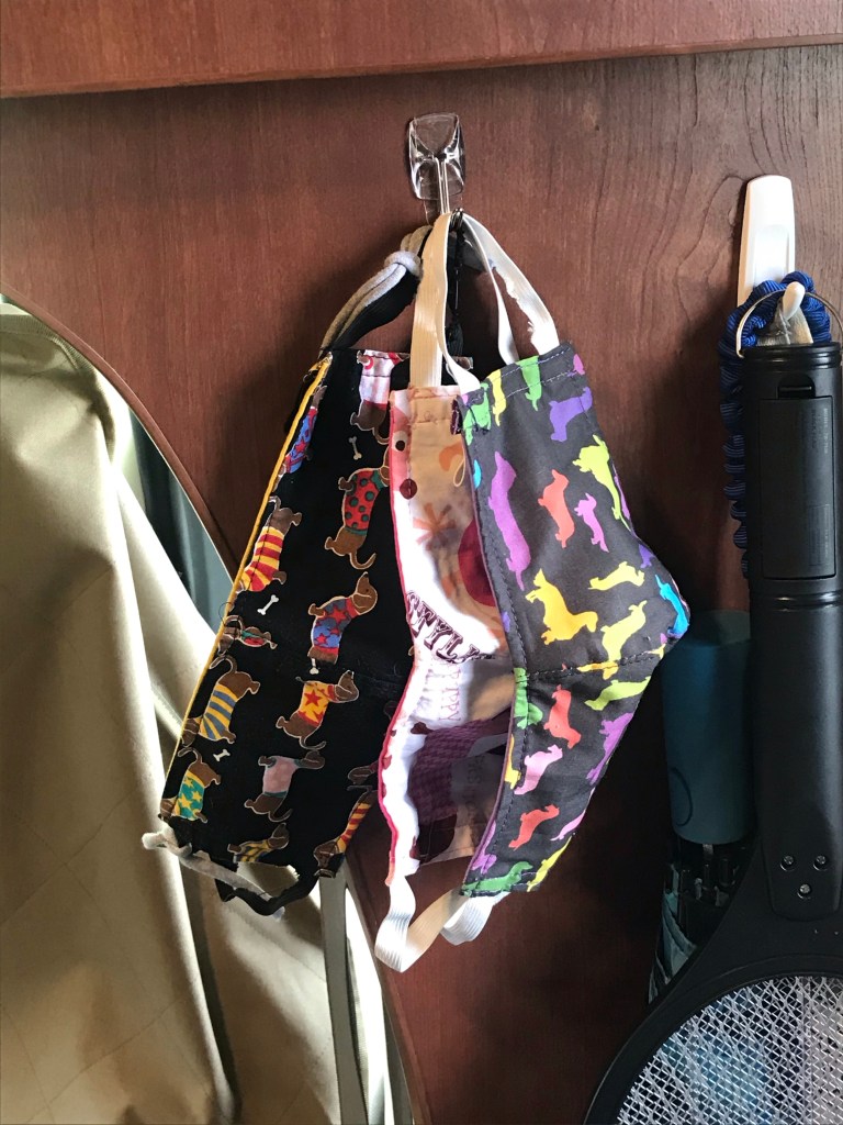 And yet, for the most part, I remain to a large extent sidelined by caution. Who would have dreamed that one of my most accessible hooks by the door in my RV would be dedicated to face masks?