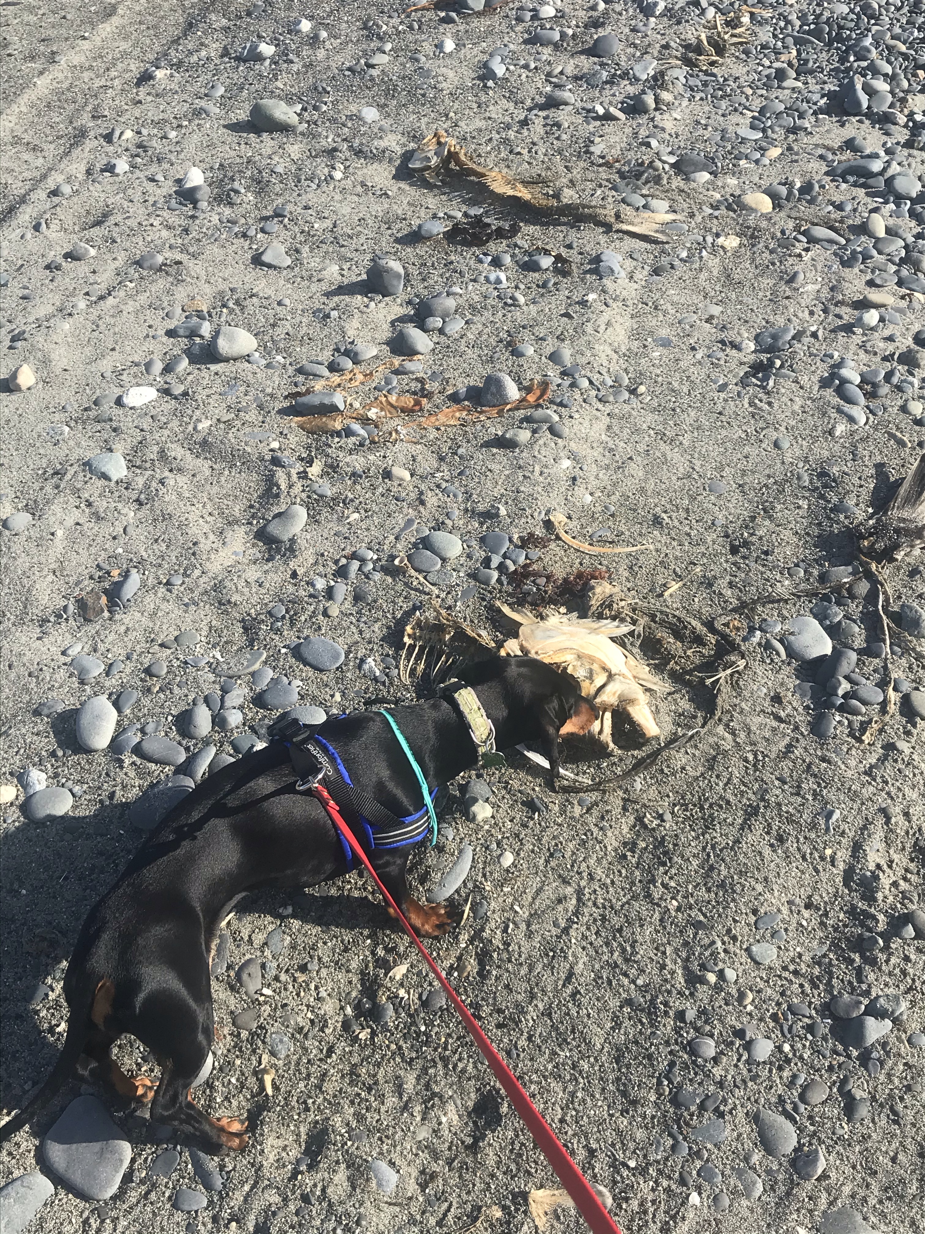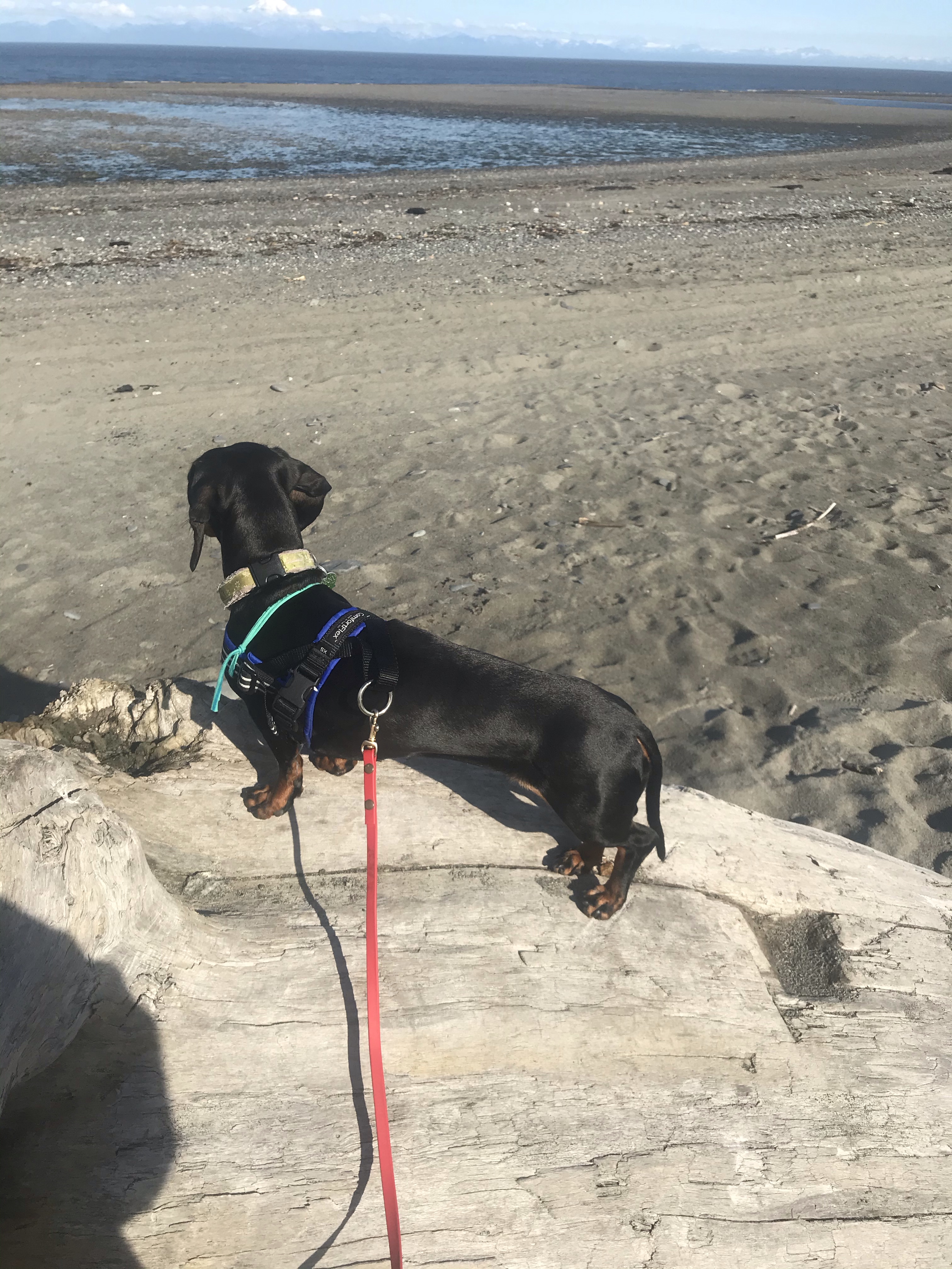 Rhonda desperately wanted to chase the many sea gulls swooping up and down the beach, but the near-constant presence of bald eagles hovering hopefully overhead limited her (and Baxter) to scant six-foot leashes.