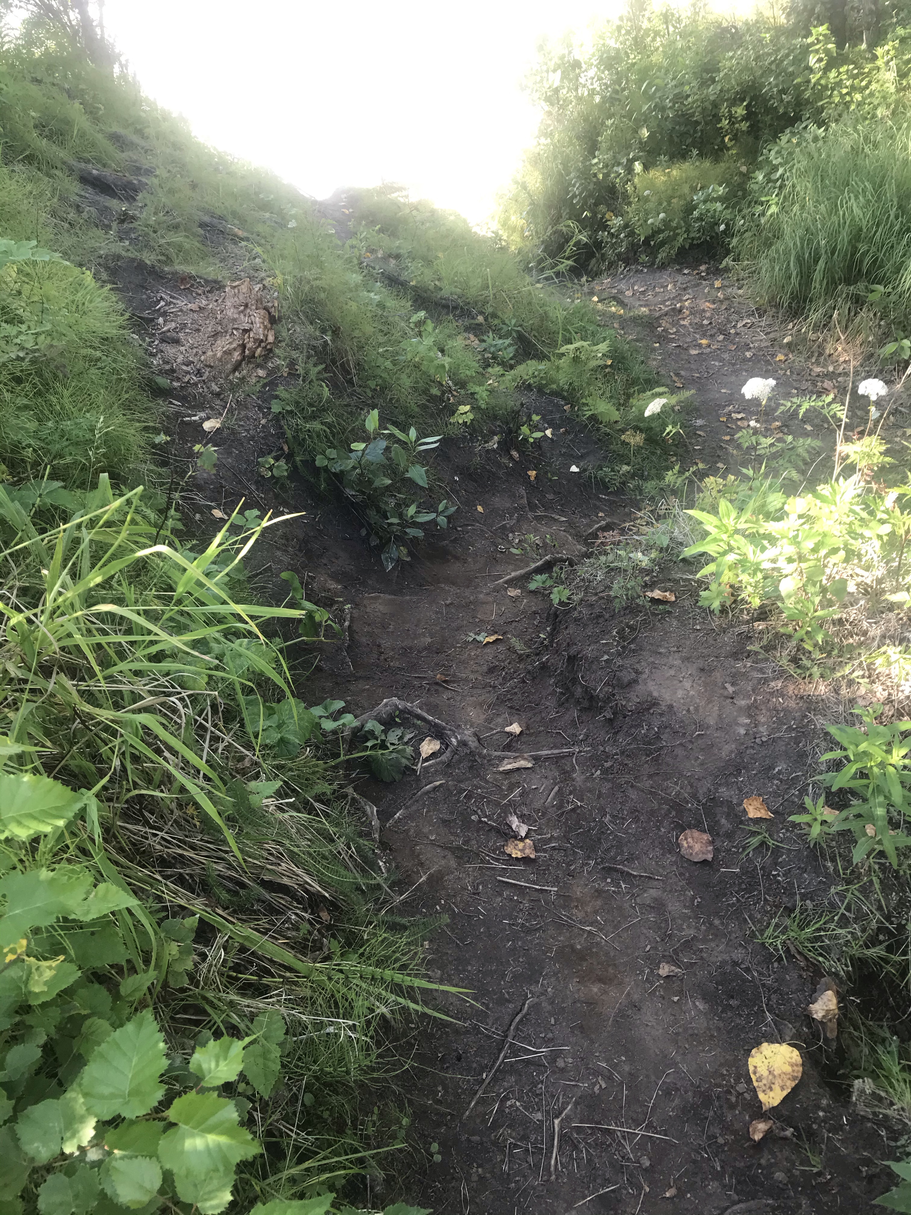 After sitting for a bit on a really uniquely patterned augen gneiss boulder, we cautiously eyed the steep dirt path we’d seen kids scampering up and down … it really was steep. Almost more climbing than walking. But it led directly up the bluff to the campground. Did we dare??