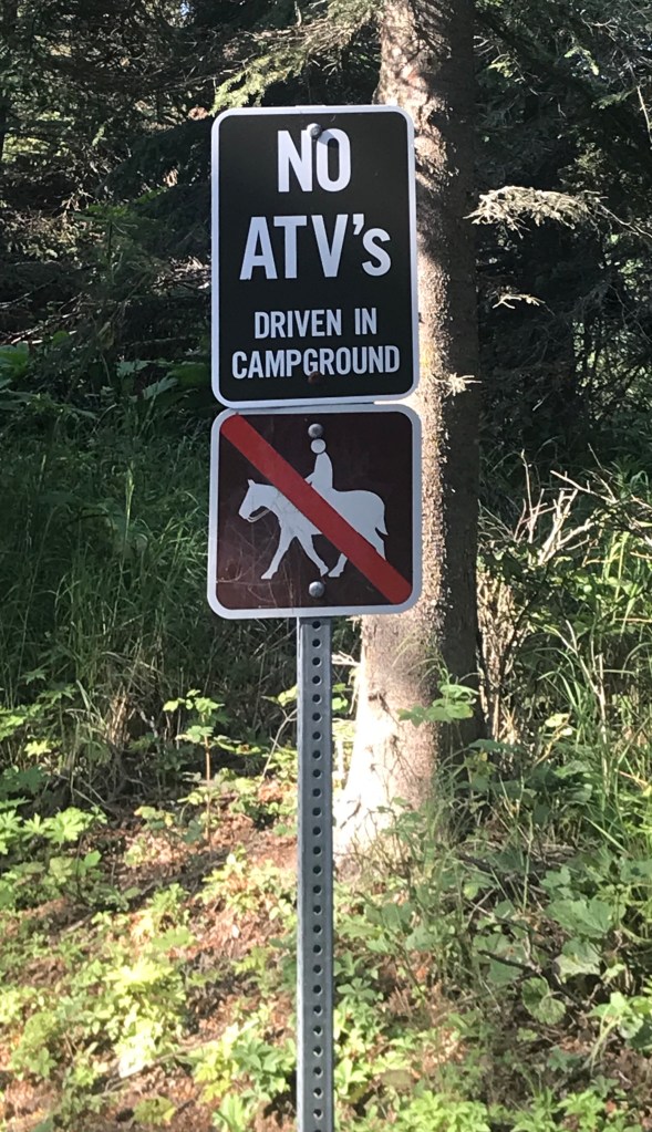 The entrance to the campground wasn’t promising; there was no way to avoid a series of massive potholes along the entire visible length, so we moved along at a snail’s pace, the RV creaking back and forth. Still, the woods were lovely and we caught enticing glimpses of Cook Inlet gleaming through the branches, so we journeyed slowly onward. Such intrepid souls!