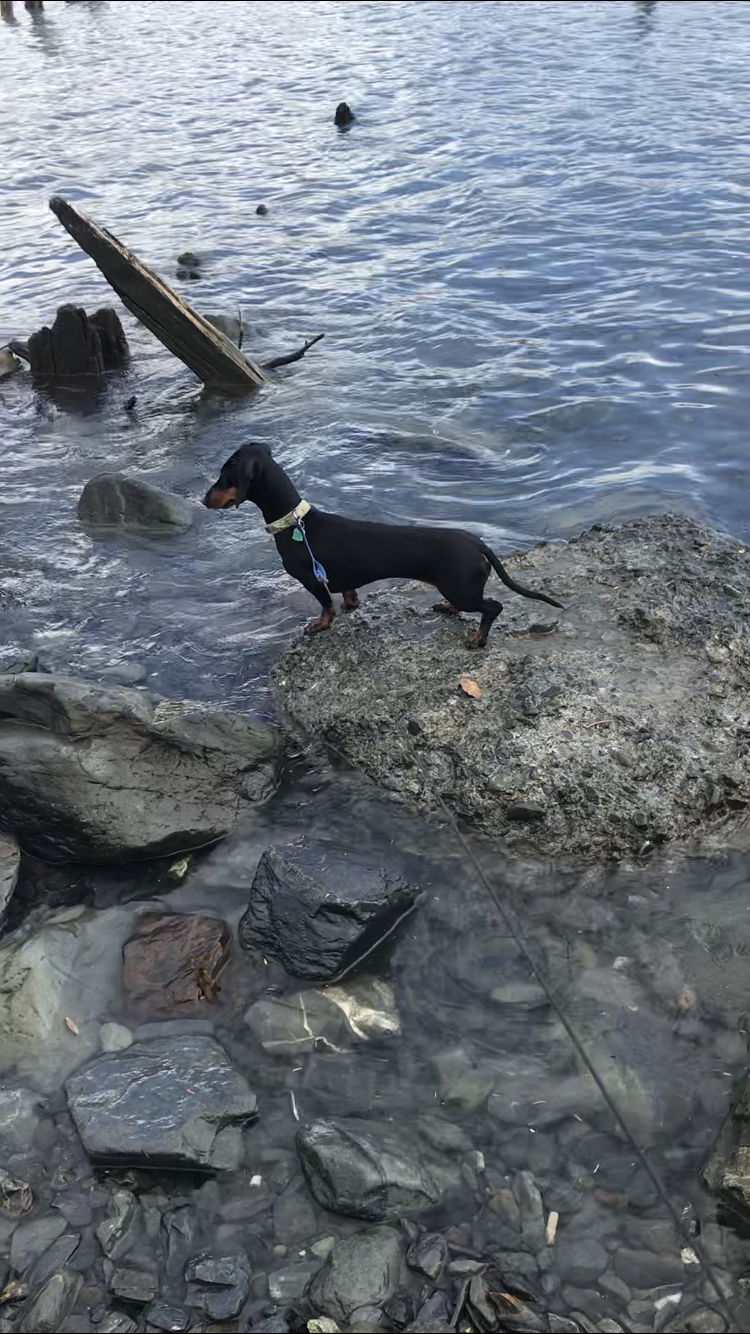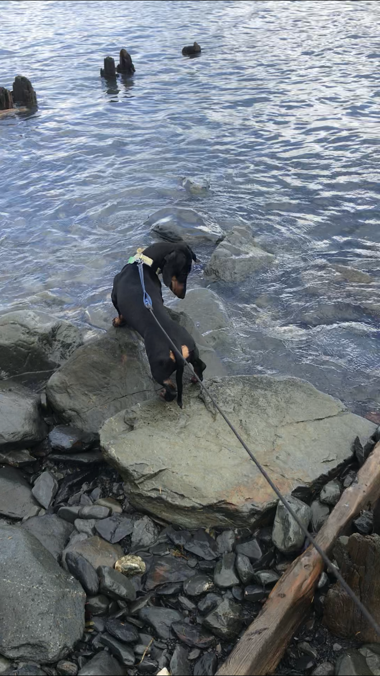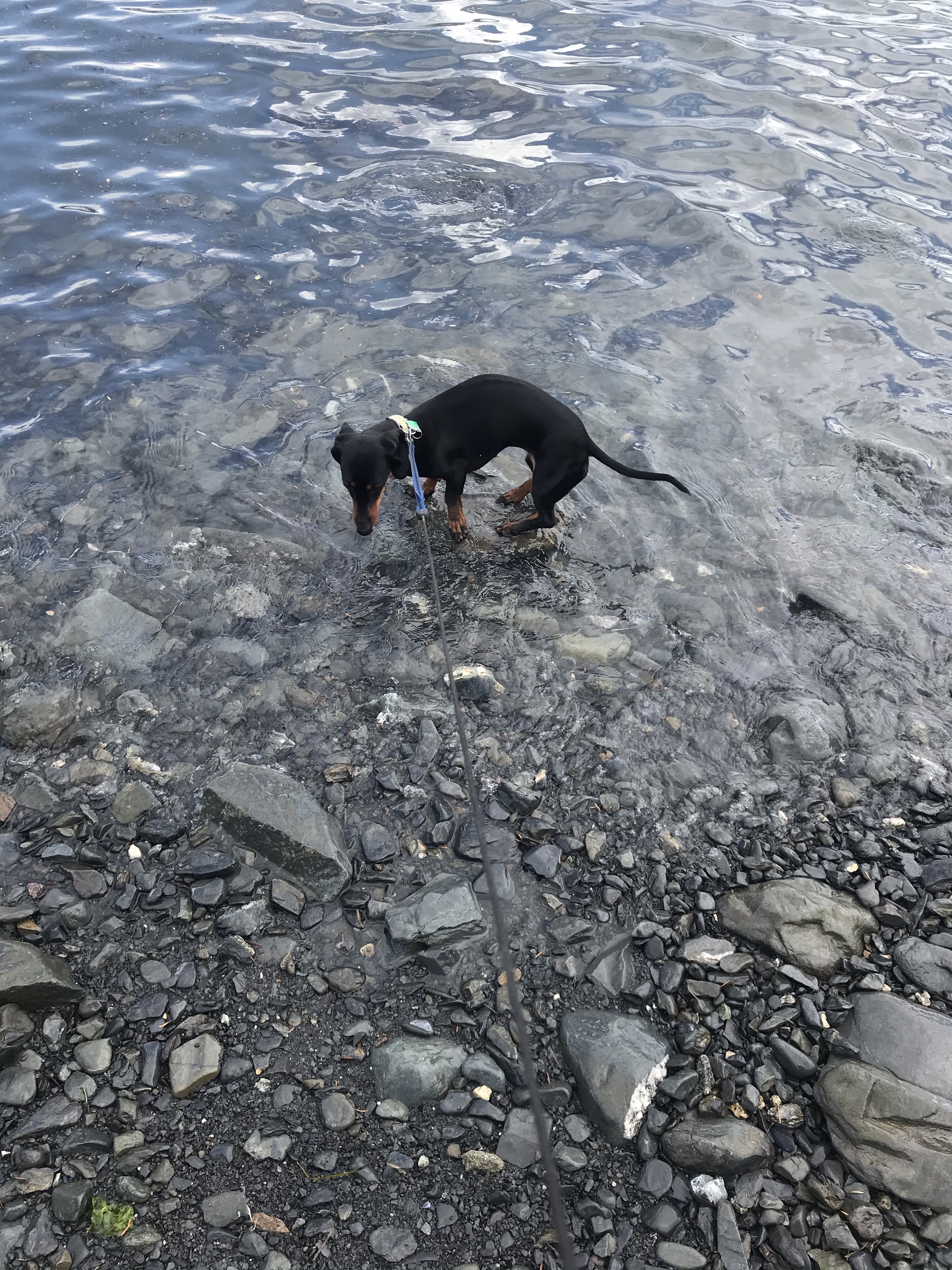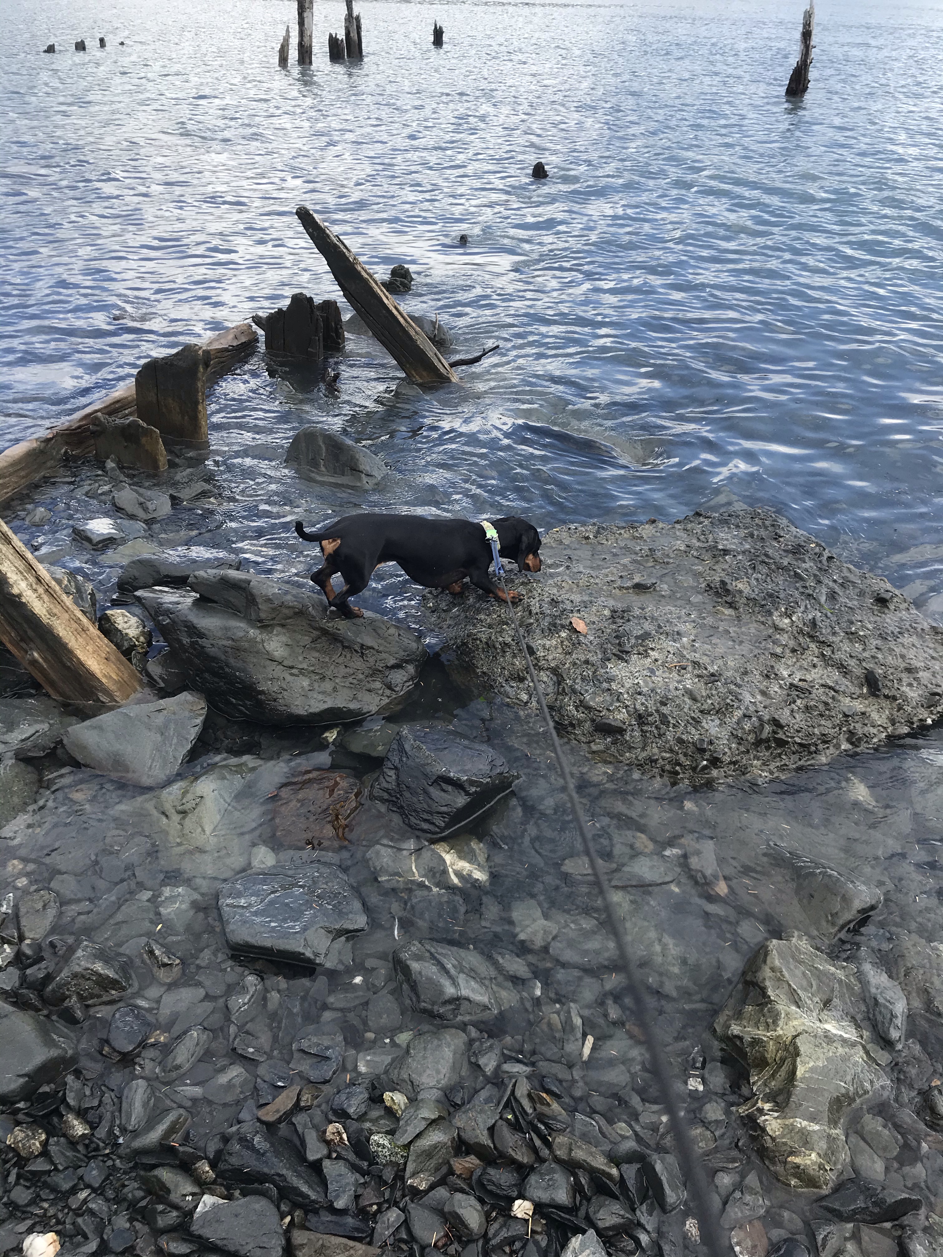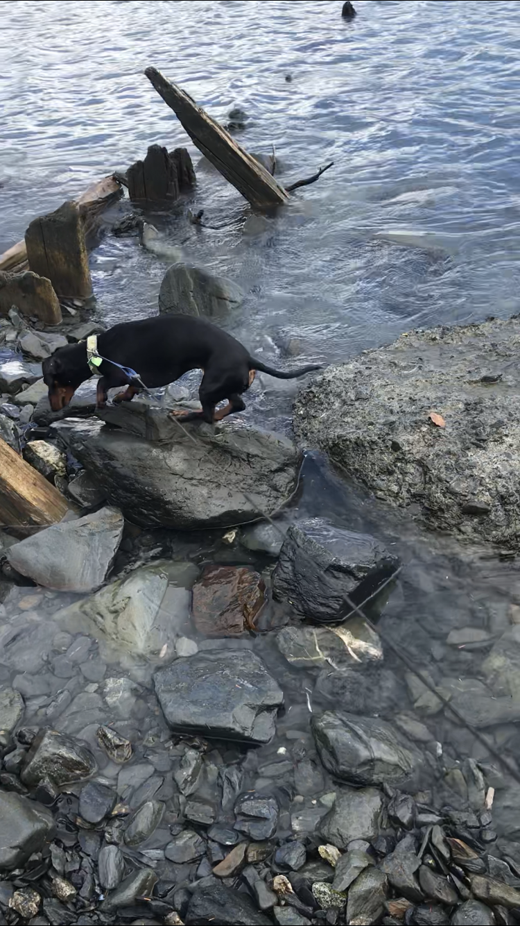 Ronni was intrigued by some tiny sea creature between the rocks and nearly took an unintended dip when waves from a passing boat temporarily submerged the rock she had jumped to, following her prey.