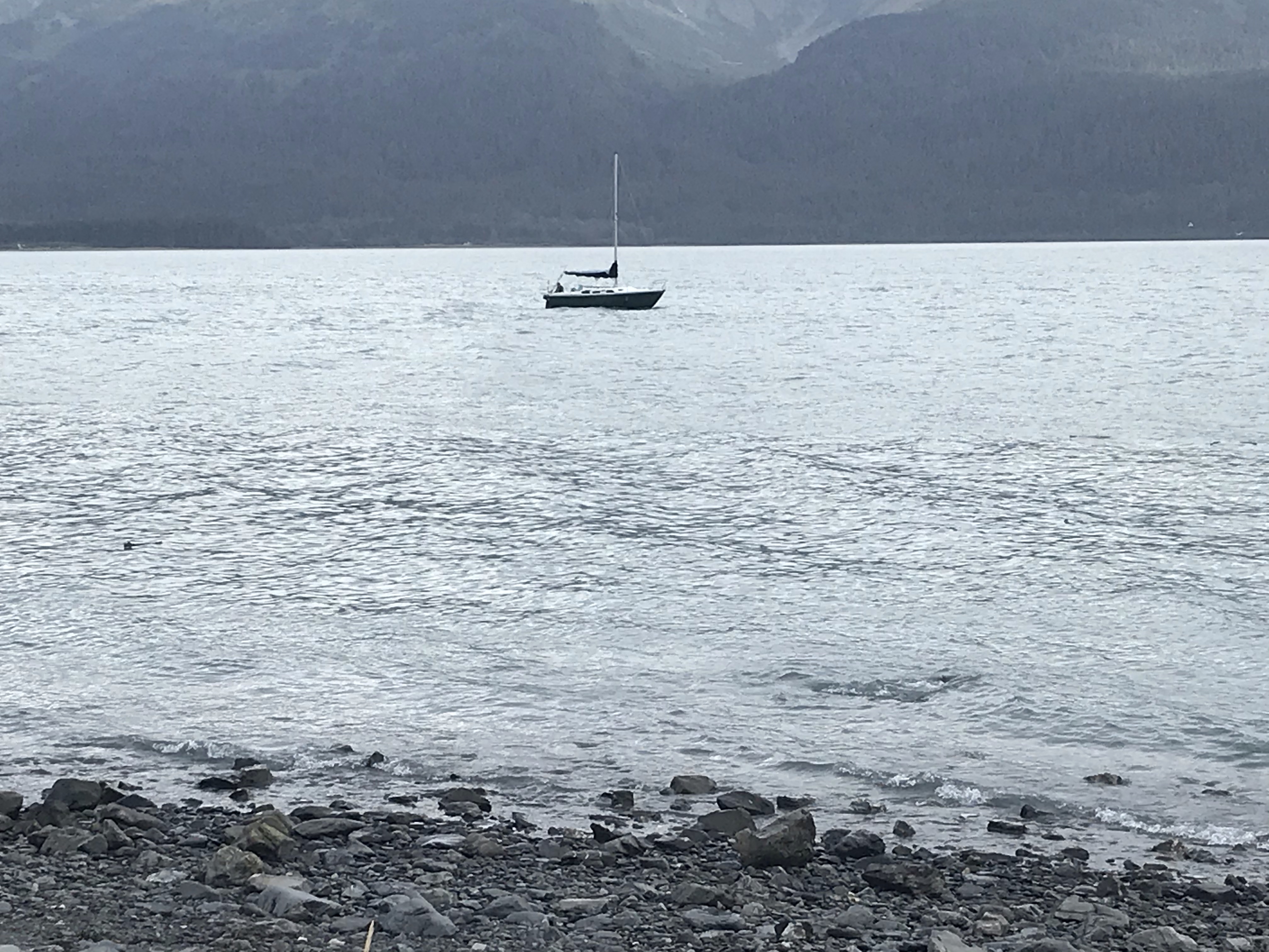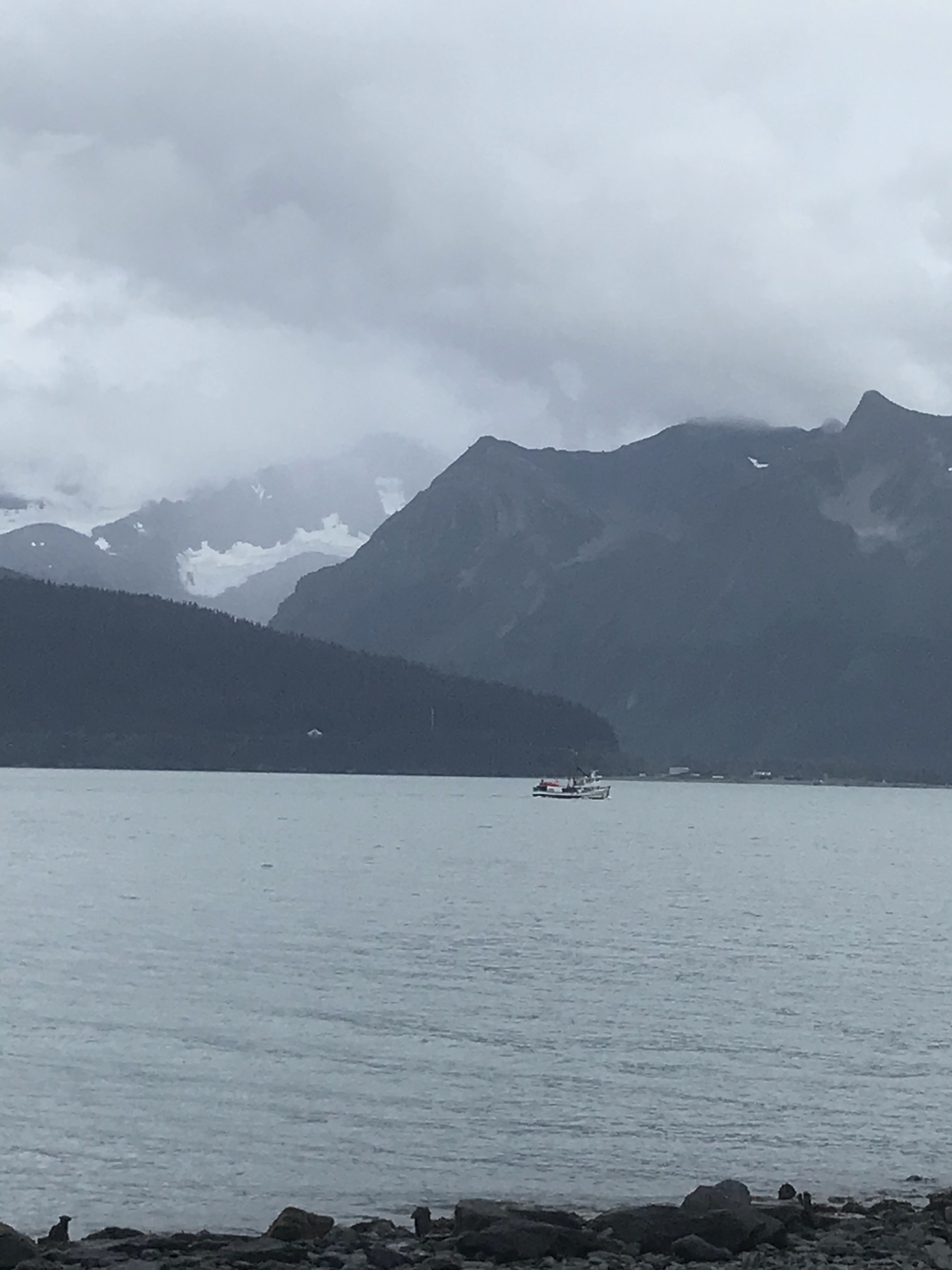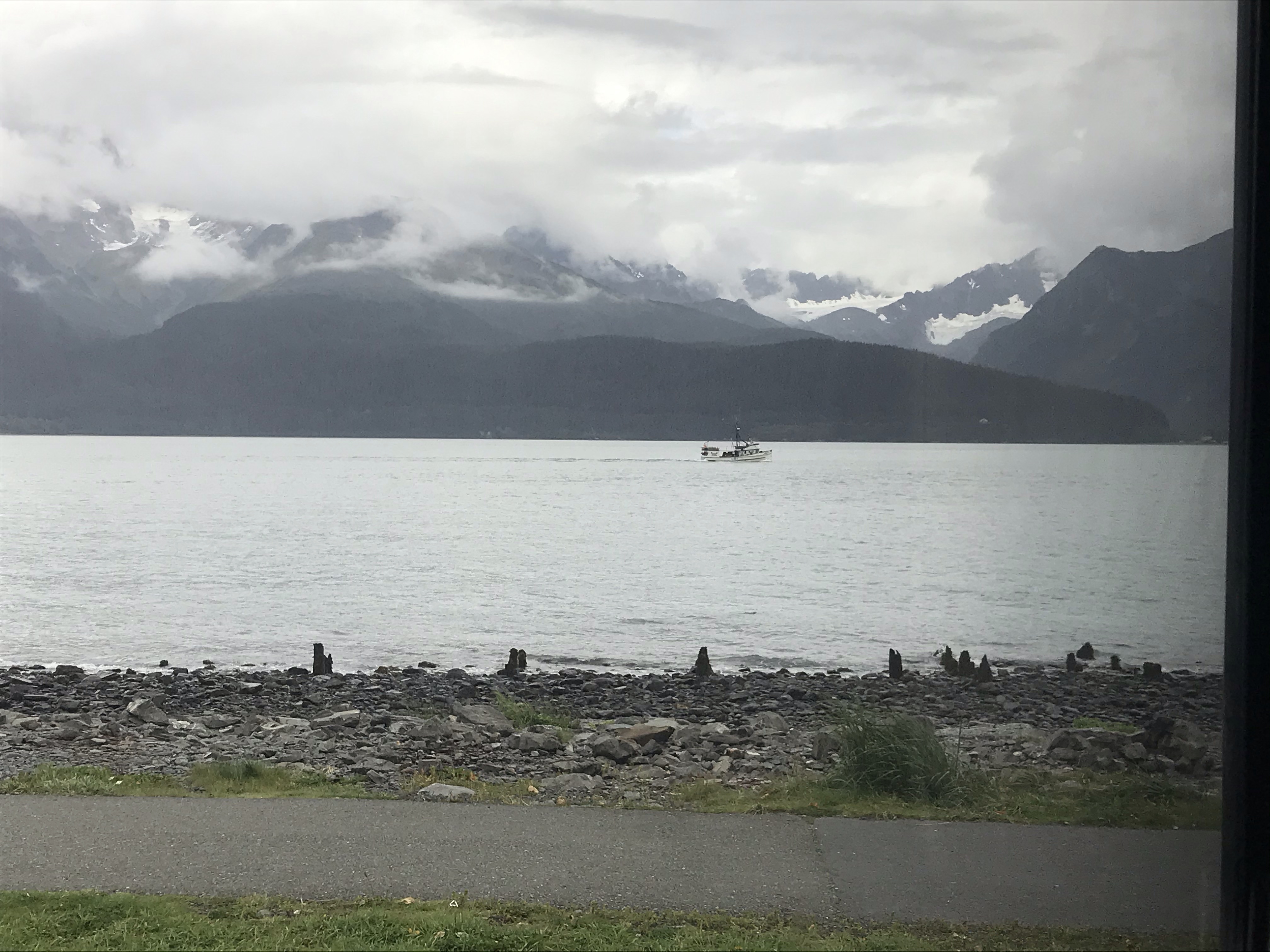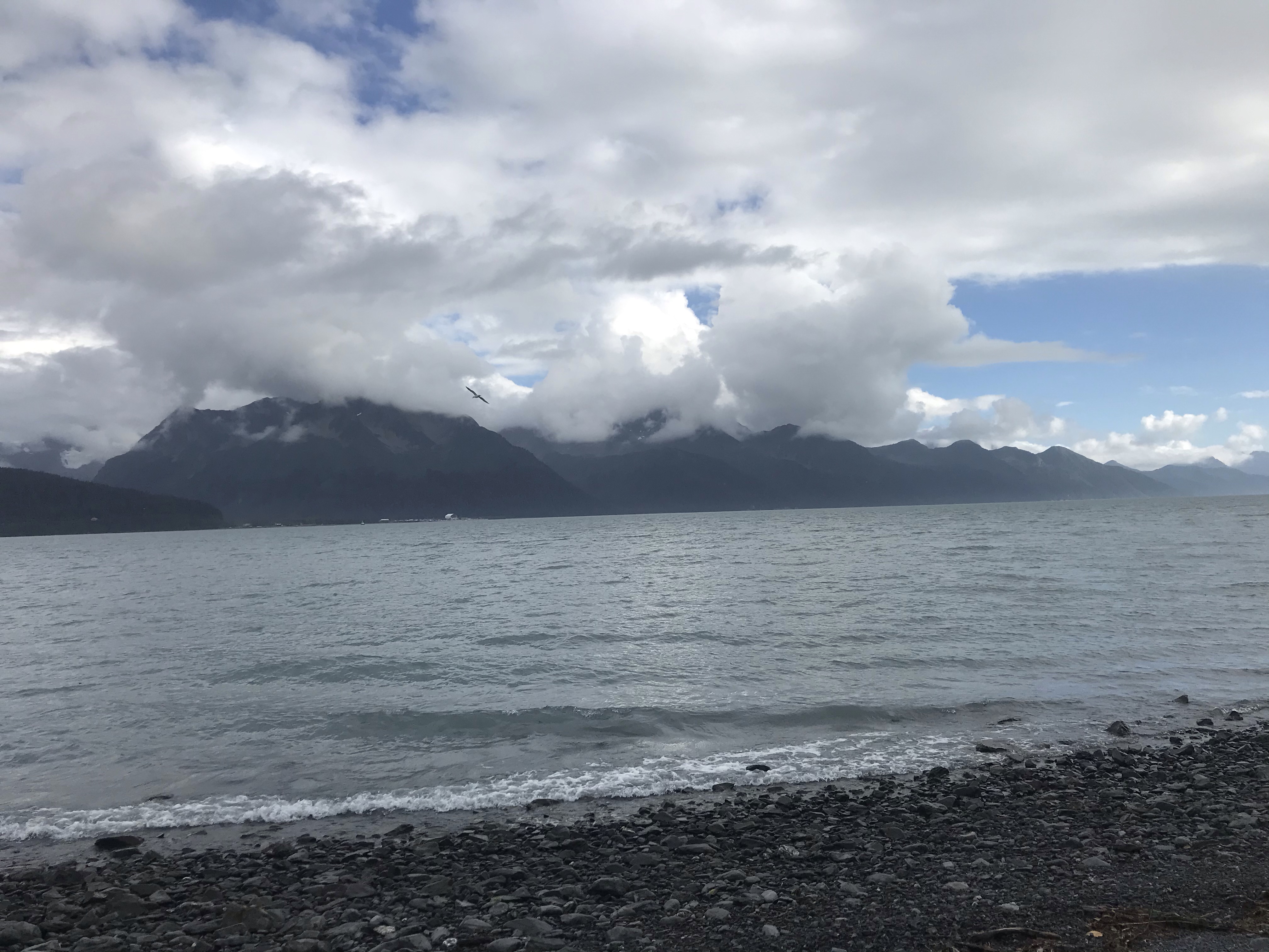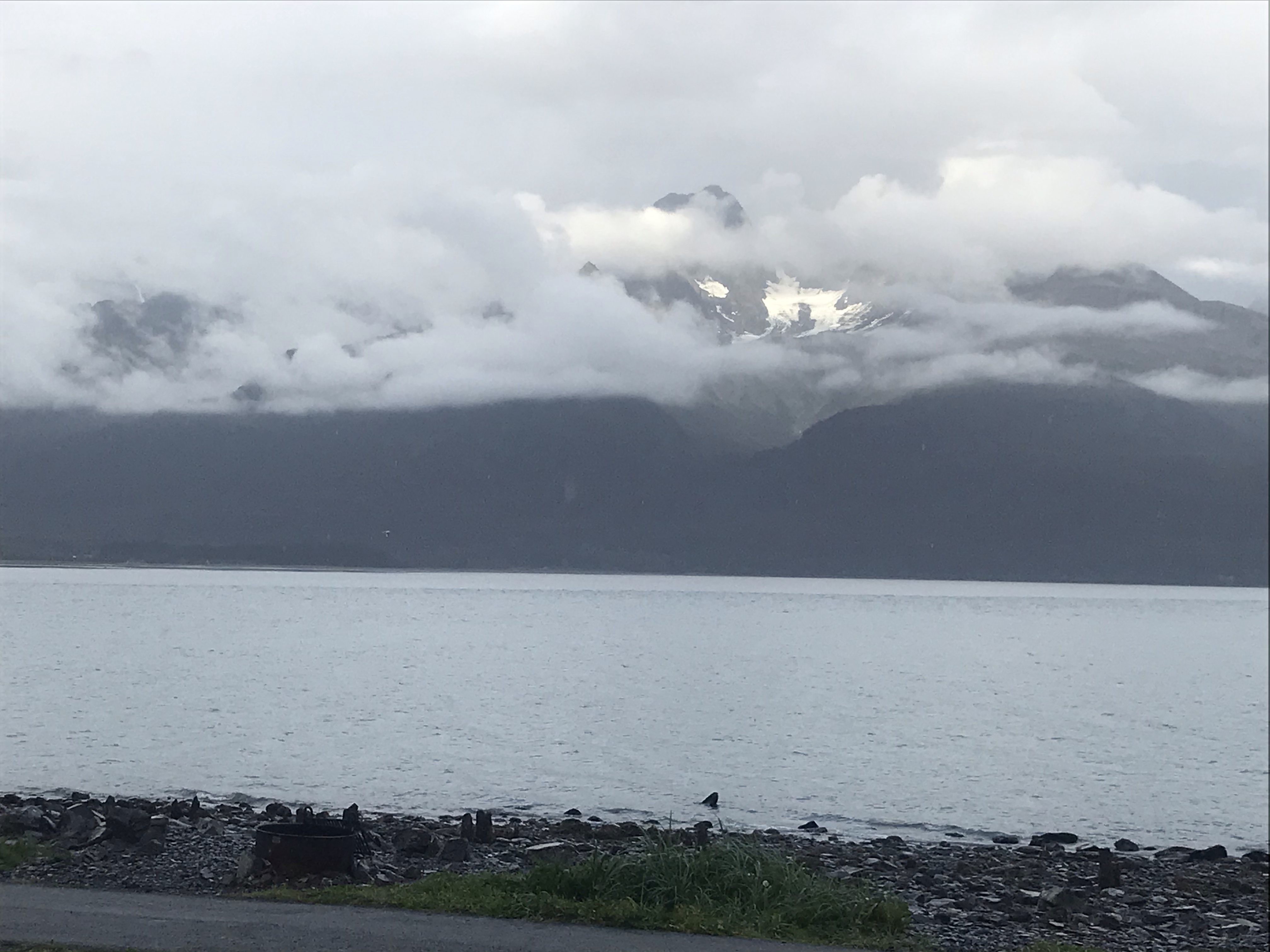 The craggy mountains across from the campground, part of the Kenai Mountain Range, are only partly visible today due to cloud cover. They afford a dramatic backdrop to the icy waters of Resurrection Bay.