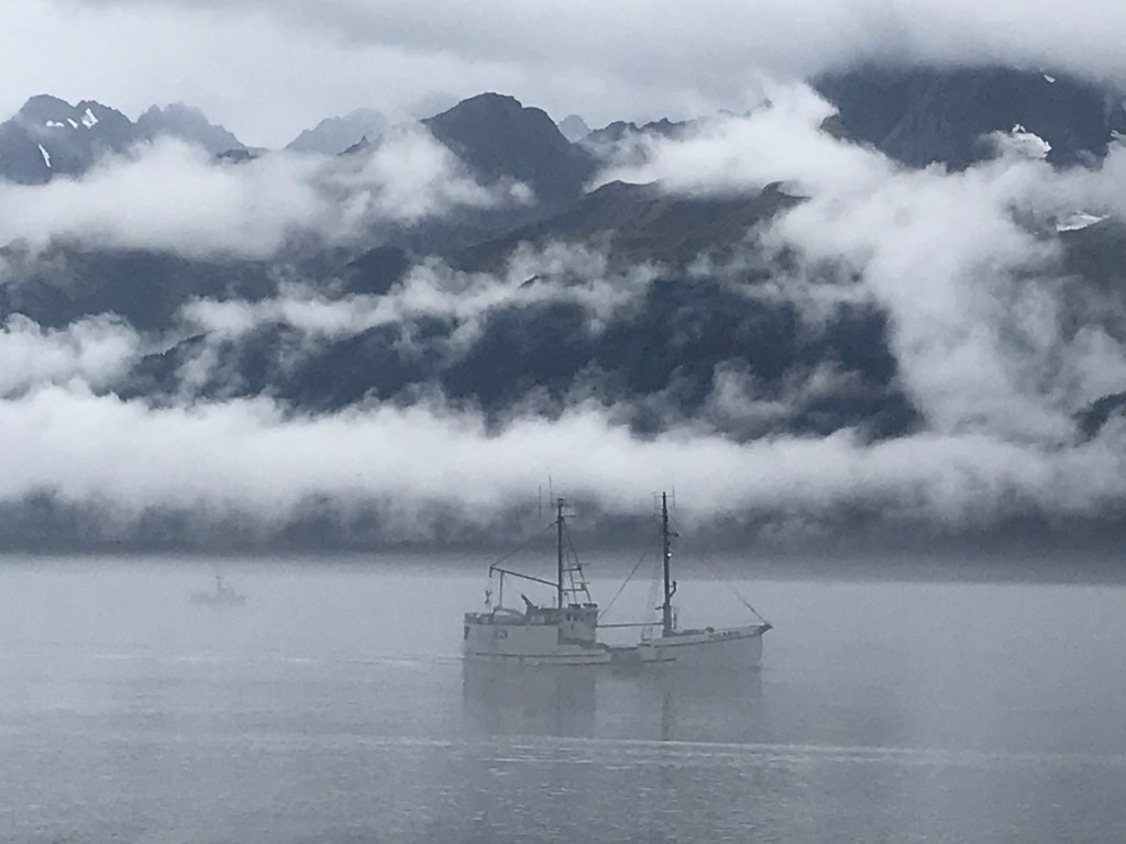 I awoke early this morning to an entirely different view out my bedroom window from what I went to sleep to. The mist-filtered morning light showed fog over the bay and clouds draped in an open, lacy pattern over the shoulders of the mountains on the far side. A fishing boat was drifting by, heading out to sea for the day. What a way to start the day.