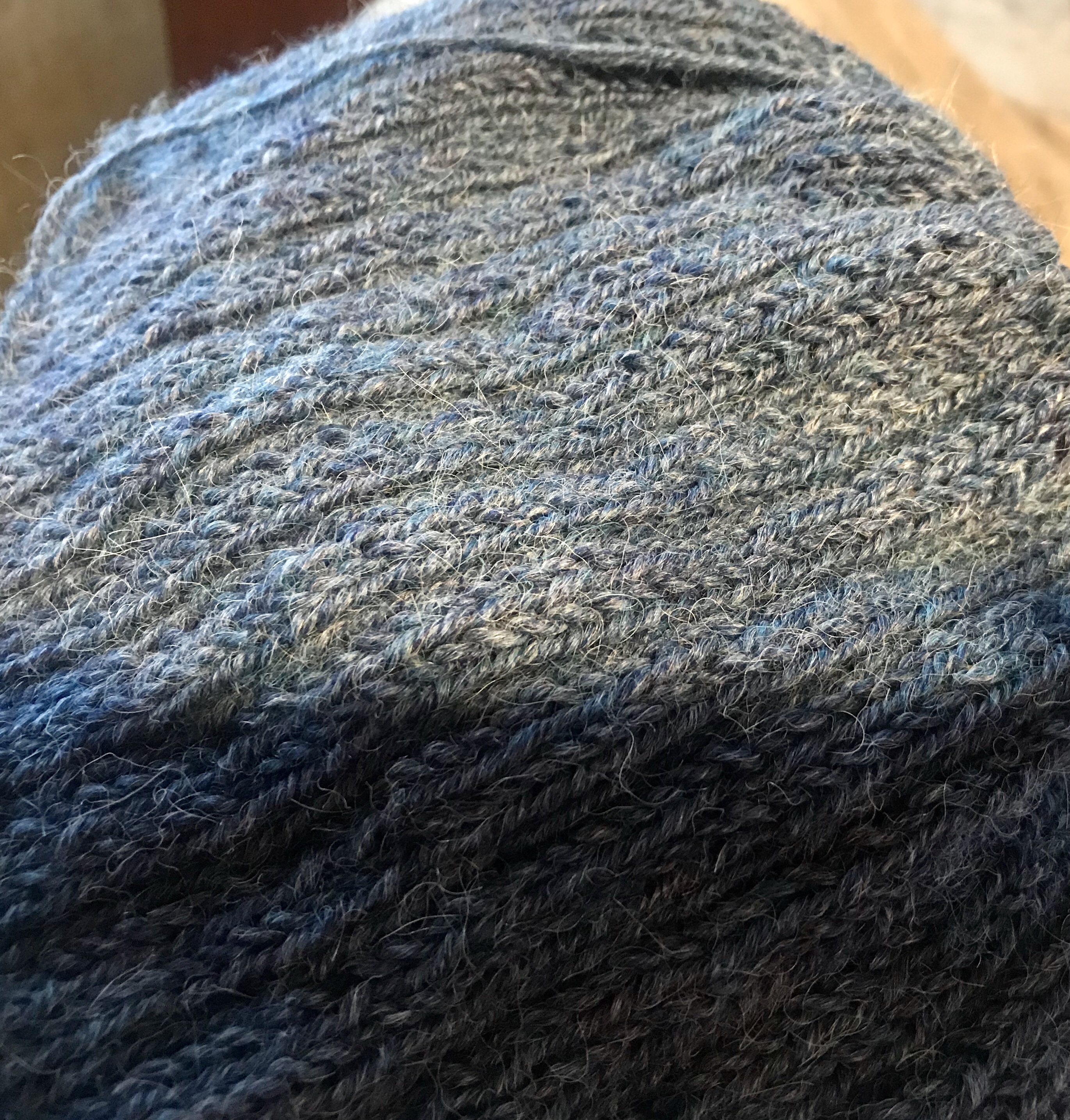 As the expected rain started up after lunch, I settled in with my current knitting project and a good Audible book. I’m working on an alpaca smoke ring – a misty blue color that suits my current surroundings and should go nicely with my dark blue down winter coat.