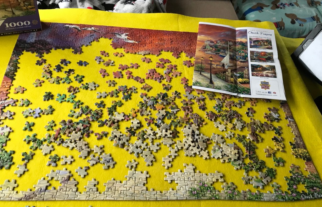 As the rain continues to fall today, I’ve been grateful for my cozy, warm RV. I have plenty of rainy day options; reading, writing, knitting, spinning and working jigsaw puzzles being high on my list.