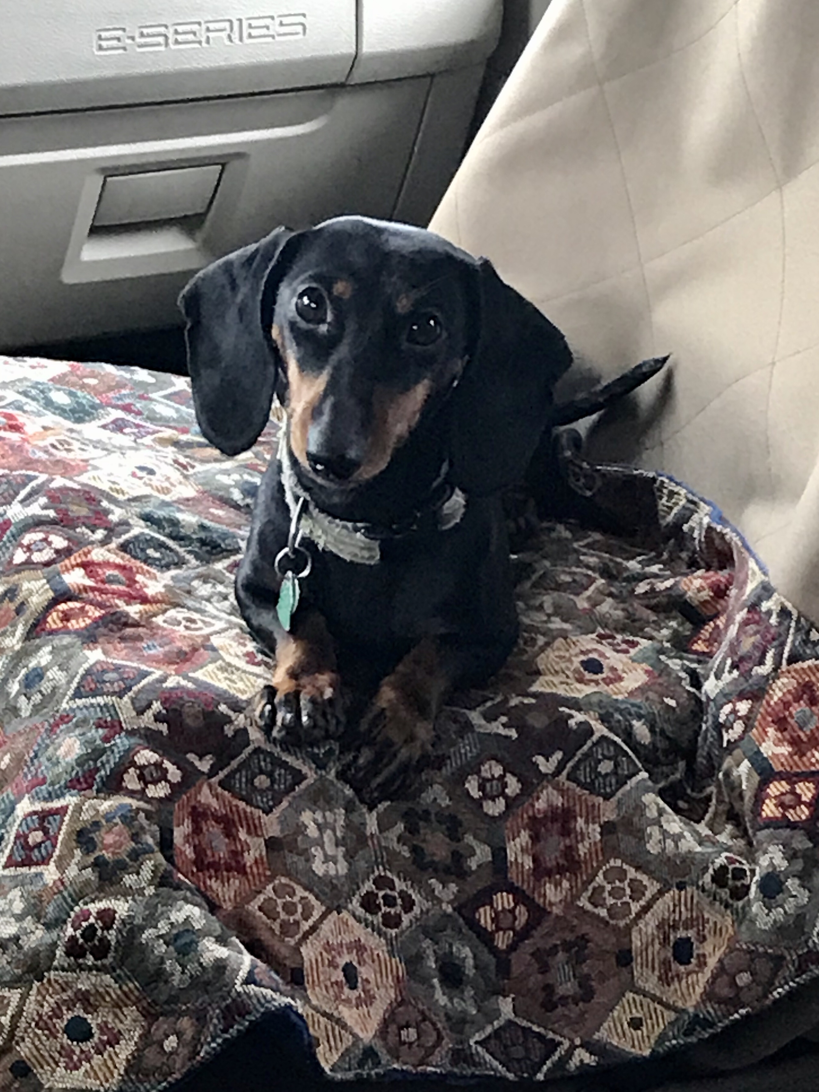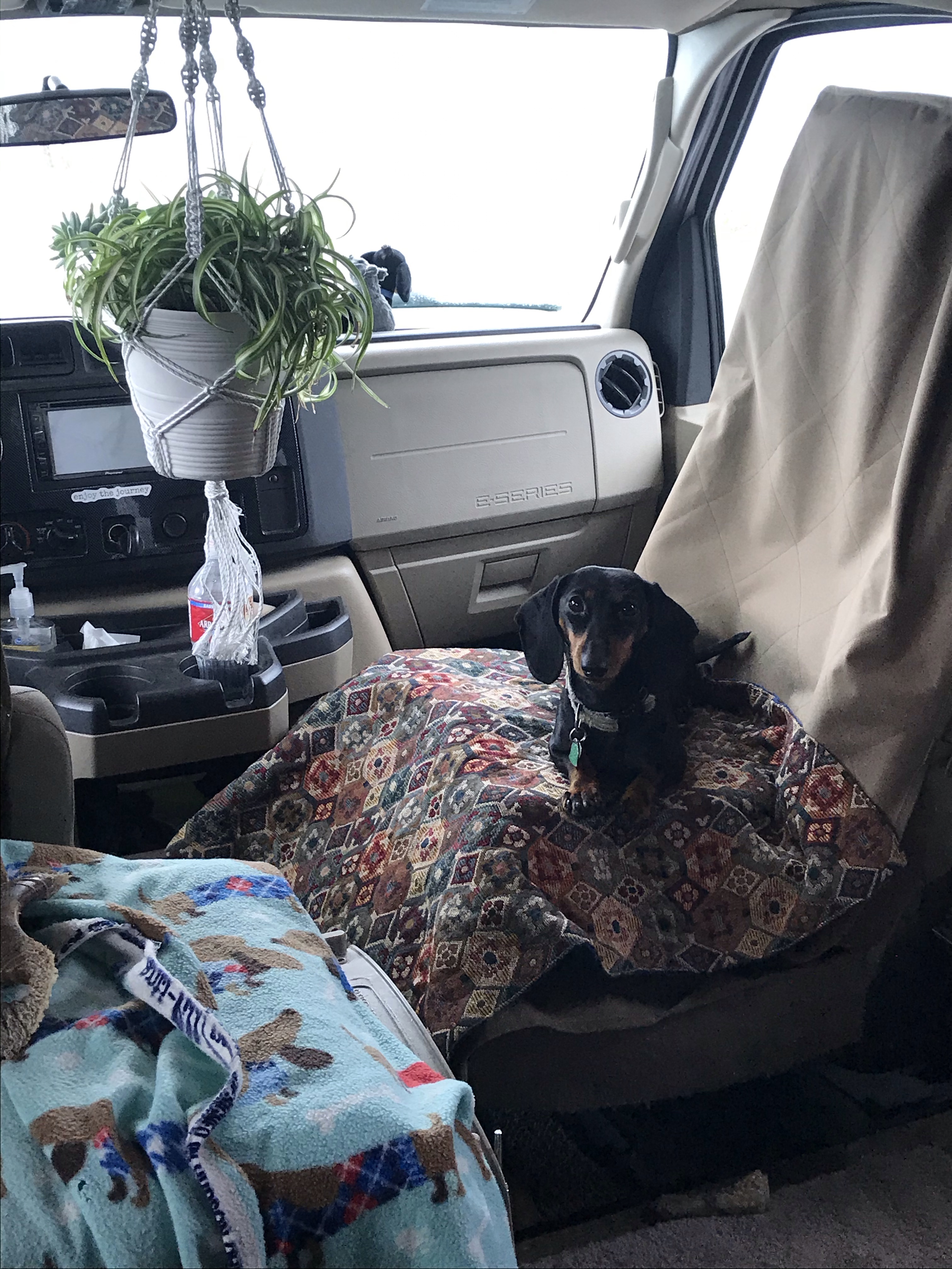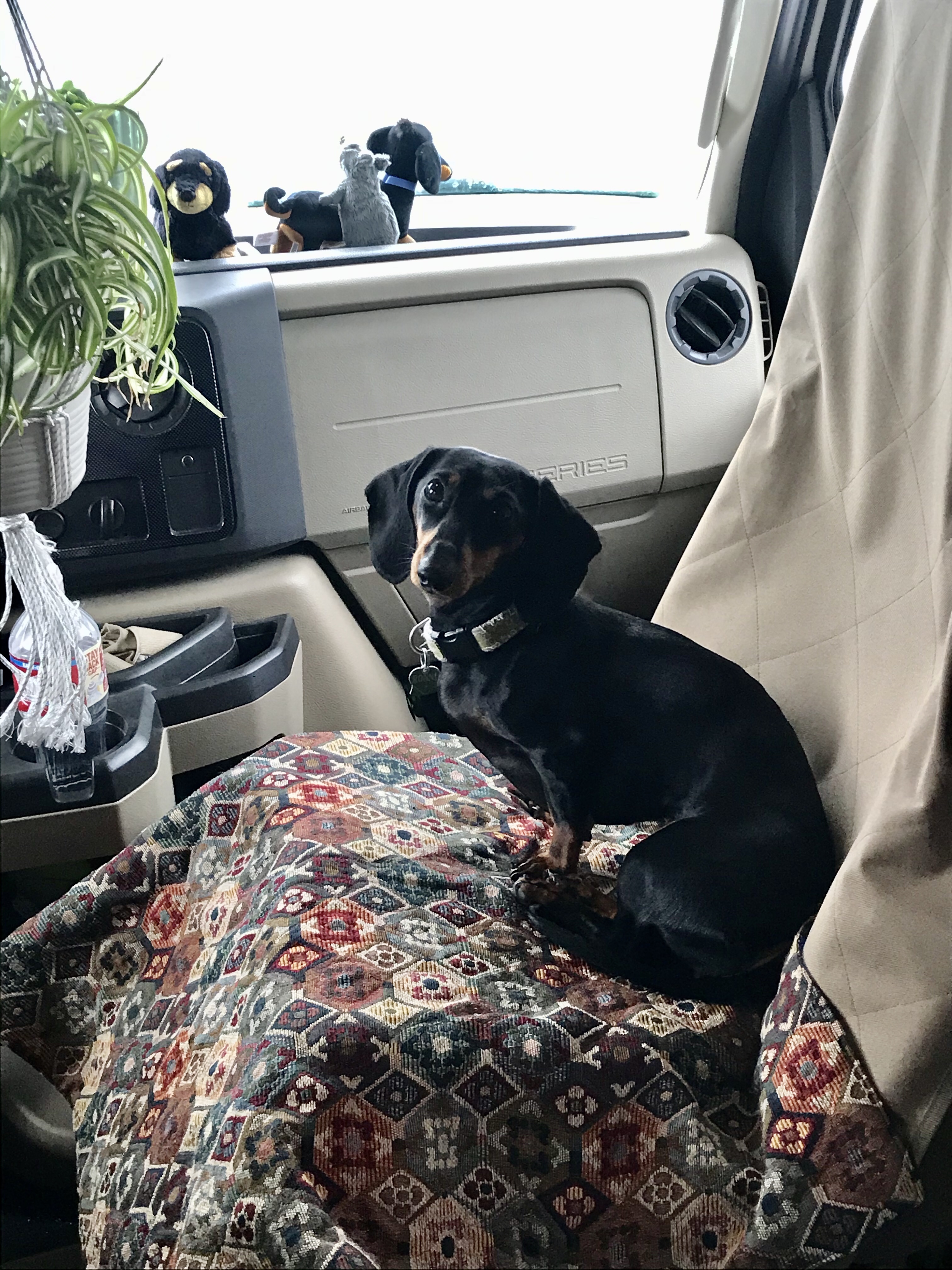 Rhonda settled in for an afternoon of people-watching out the front window from the comfort of the swivel passenger chair. She’s proven to be a [mostly] polite and fairly quiet travel companion, even when joggers and dog-walkers pass by. She WILL promptly announce anyone actually approaching the door though, which is absolutely fine with me. 👍🏼