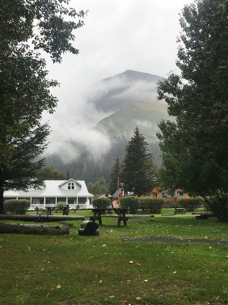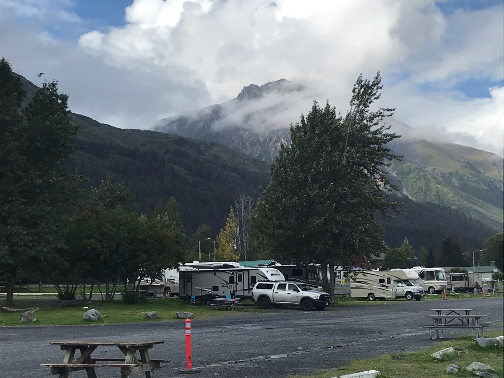The waterfront campground is situated between the bay and the small town of Seward, with more of the massive Kenai Mountain range looming behind the town.