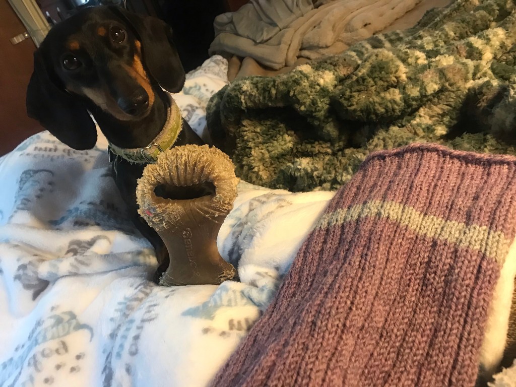 Remind me to regale you sometime with the story (from many years ago) of how our dachshund, Baxter (currently age 10, in spite of his antics), chewed up, destroyed and partially ingested an absolutely lovely skein of hand-spun, lace-weight Qiviut yarn. Seriously, if I hadn’t been so worried about him dying from swallowing the yarn – I might’ve just killed him myself! Ack!