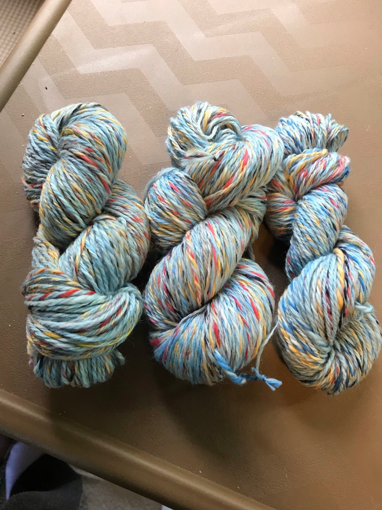 I honestly haven’t done a lot of spinning since finishing my “Sky Blue Pink Turning Yellow in the Moonlight” yarn last spring. This colorful sport-weight, 3-ply yarn has yet to tell me what it wants to become, so it sits, skeined and resting, in a box in my bedroom – carefully stored out of cat AND dog reach.