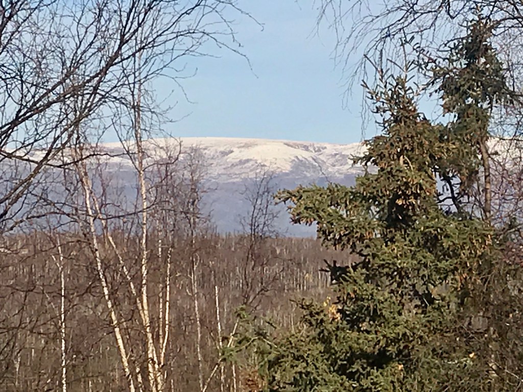 We had an afternoon of heavy dark clouds obscuring the local mountains yesterday, along with periods of light rain. As expected, this morning’s chill sunshine exposed fresh snow, “termination dust” as we call it here, nearly halfway down the flanks of the Talkeetna Mountain range to the north of our house.