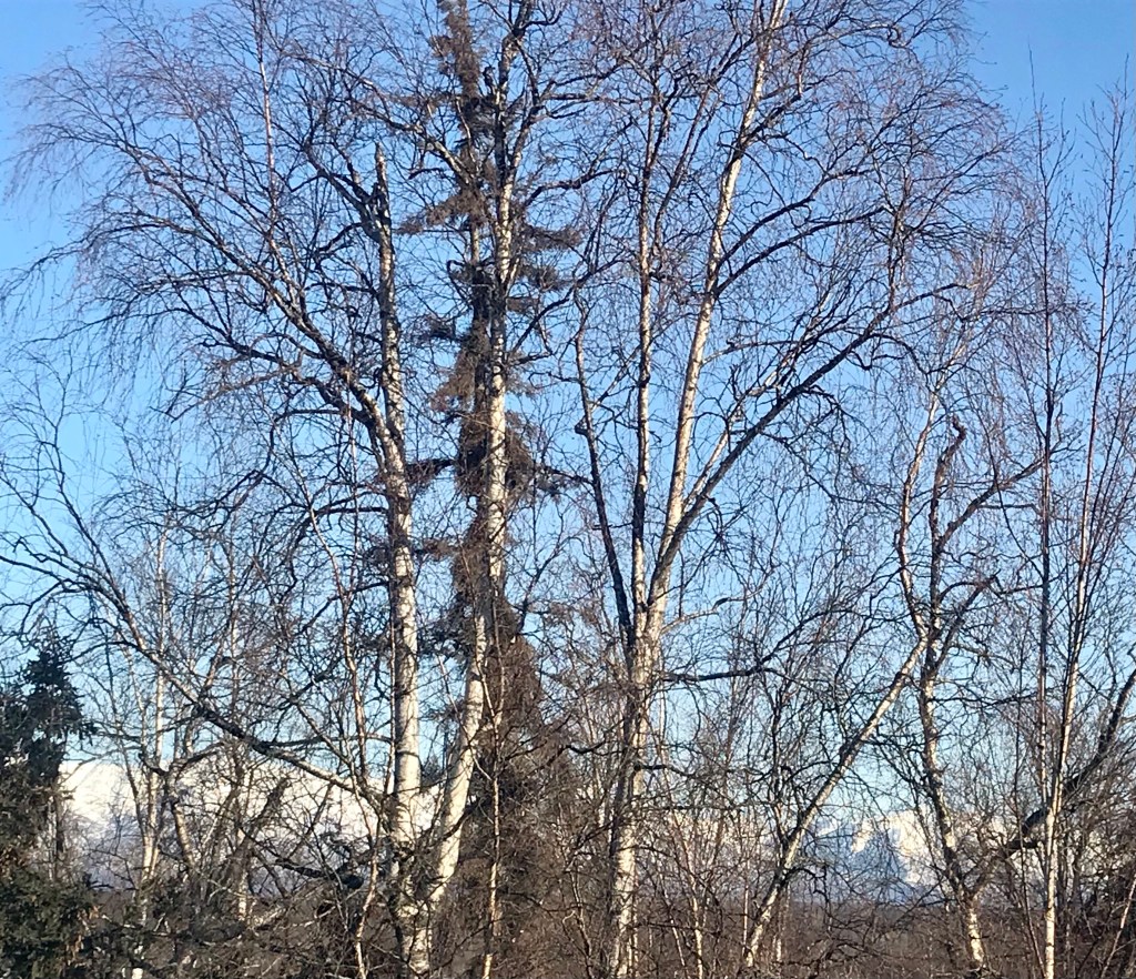 I have a large, north-facing picture window in the bedroom, offering a view from my bed of the trees, the valley below and the Talkeetna Mountains in the distance. I love watching the sun come up through the trees, and this time of year, the sun rises late enough for me to fully appreciate it. 😉