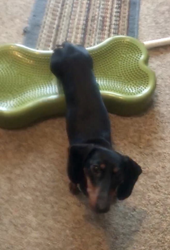 A good way to teach hind-foot awareness is by having the dog back up onto a low platform or box. For Ronni, this old, deflated balance-bone was perfect. 👍🏼