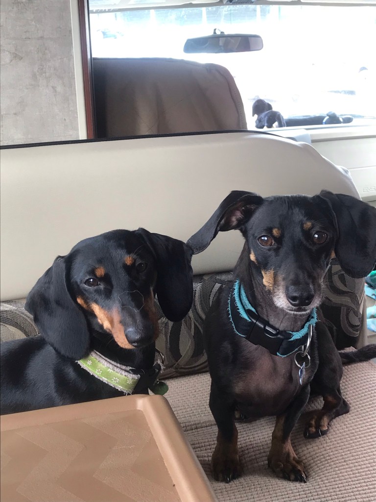 Both Dachshunds have enjoy travel in the RV for the past three summers and I’ve fulfilled a “bucket-list” item by traveling all over Alaska with my matched pair of black & tan dachshunds. I enjoy the cheerful looks we get when walking them and the conversations they generate at campgrounds.