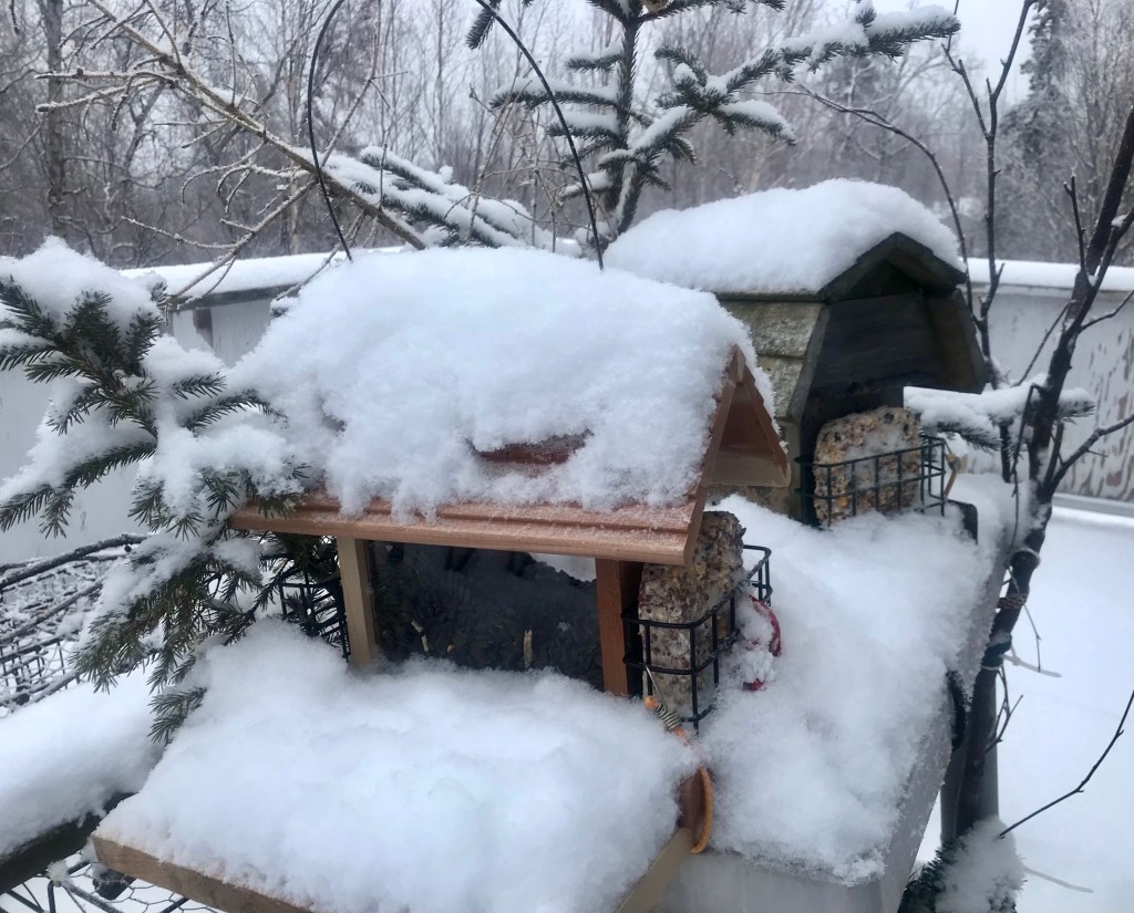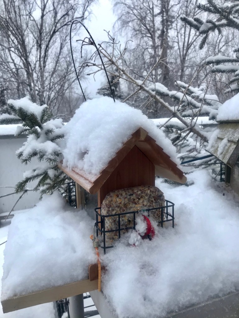 I awoke to a fresh winter wonderland this morning – and some very unhappy birds! Their feeder was buried under 2-3” of white, fluffy snow and not a sunflower seed (their fav, hands down) to be had! Not exactly a blizzard 🤷♀️, but sort of inconvenient for the smaller birds.