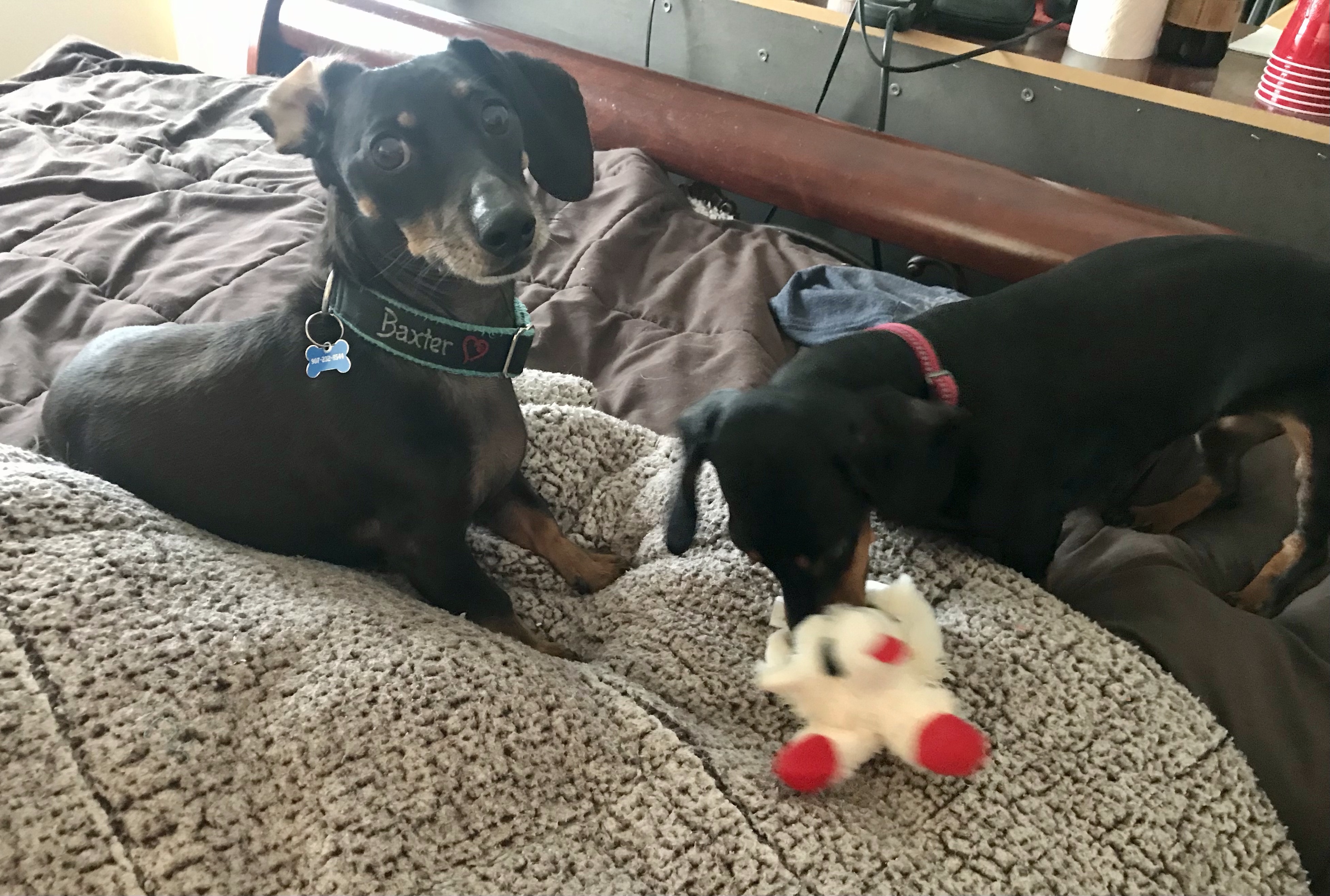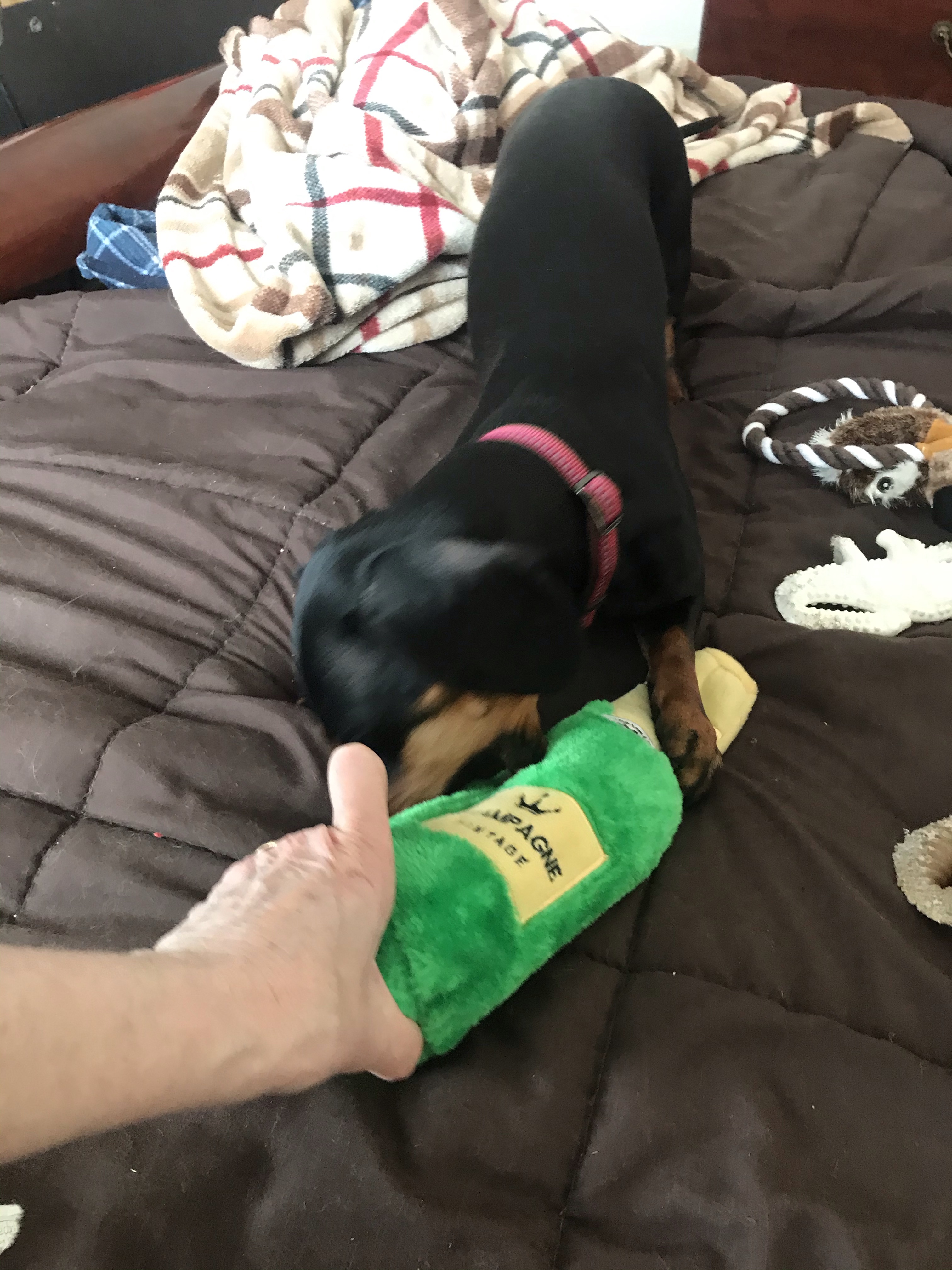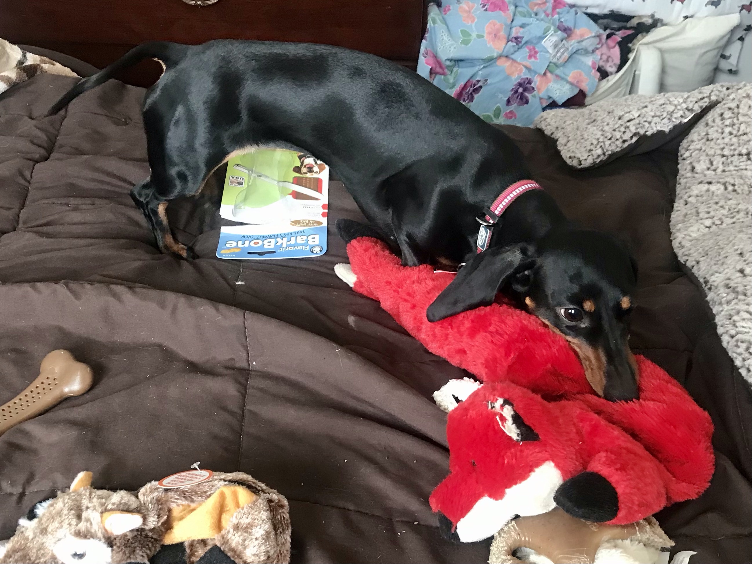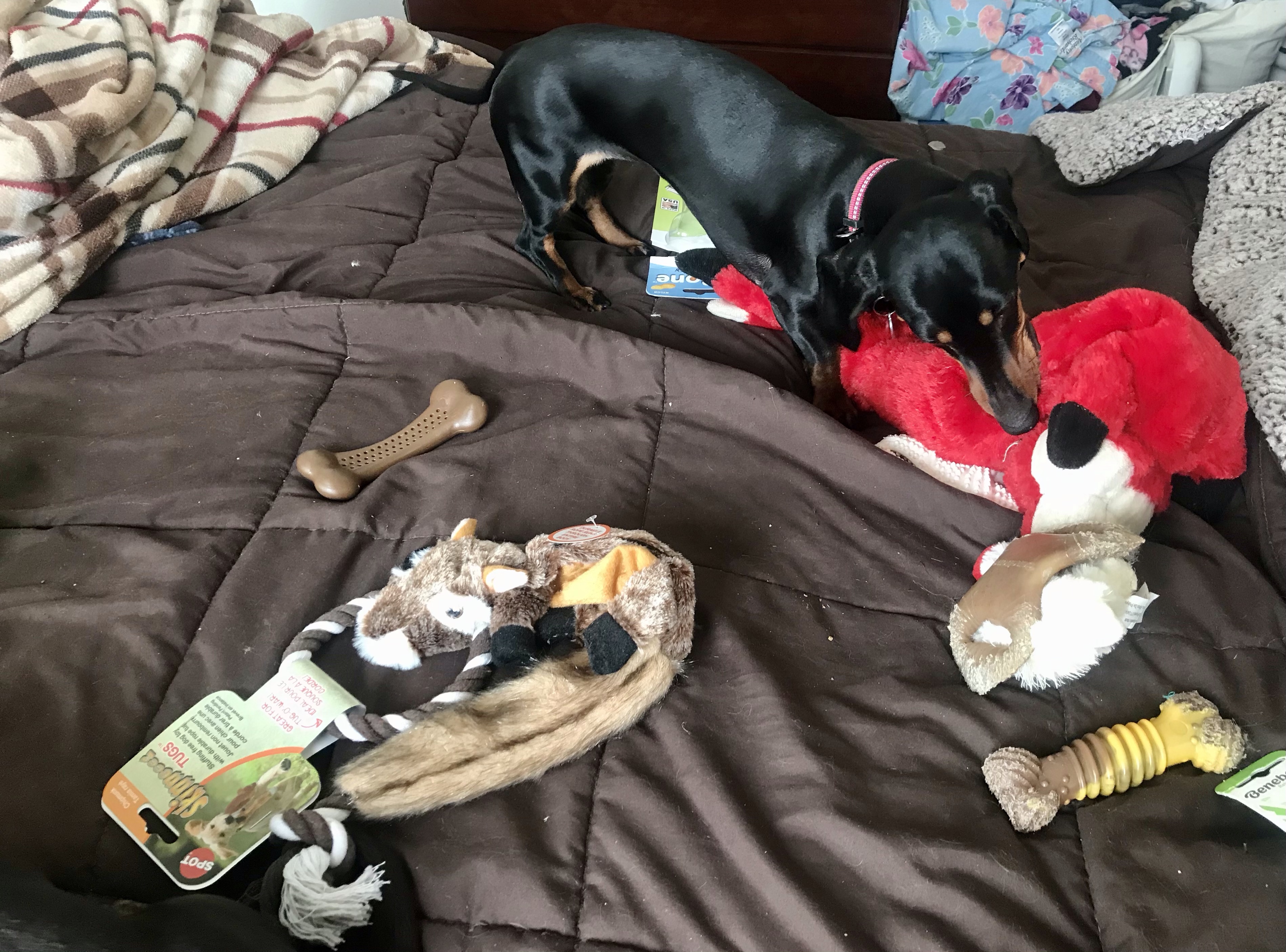 More new toys followed, spaced throughout the day, and my bed became “toy central” as Ronni and Baxter competed in party games such as Tug-a-war, Kill the Squeaky, Chase the Giggle-Ball and more!