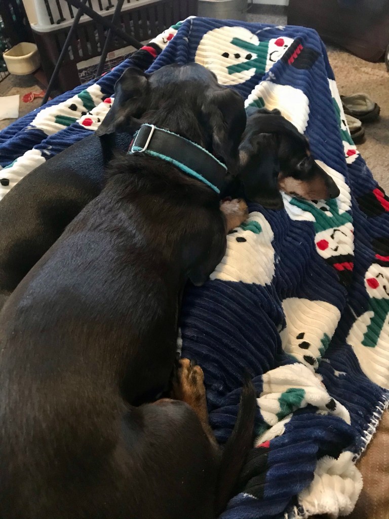 Our tired out dachshund duo finished the day contentedly snoozing in a dog-pile on Mom’s lap.