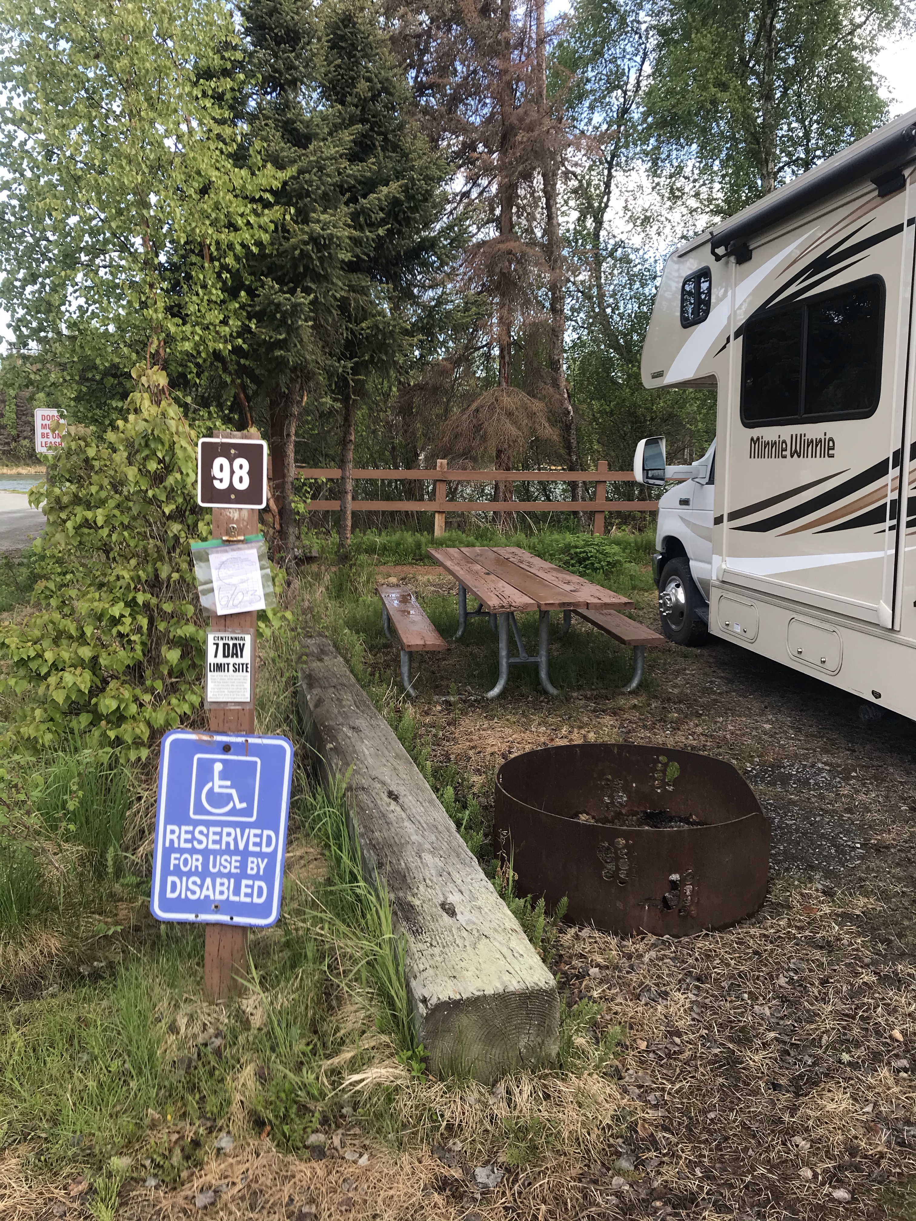 A bit more than an hour later, I pulled into my chosen destination. Centennial Park Campground, with over 200 roomy campsites – some of them situated right on the lovely walking path meandering along the Kenai river. This is one of my favorite stops in the Soldotna area.