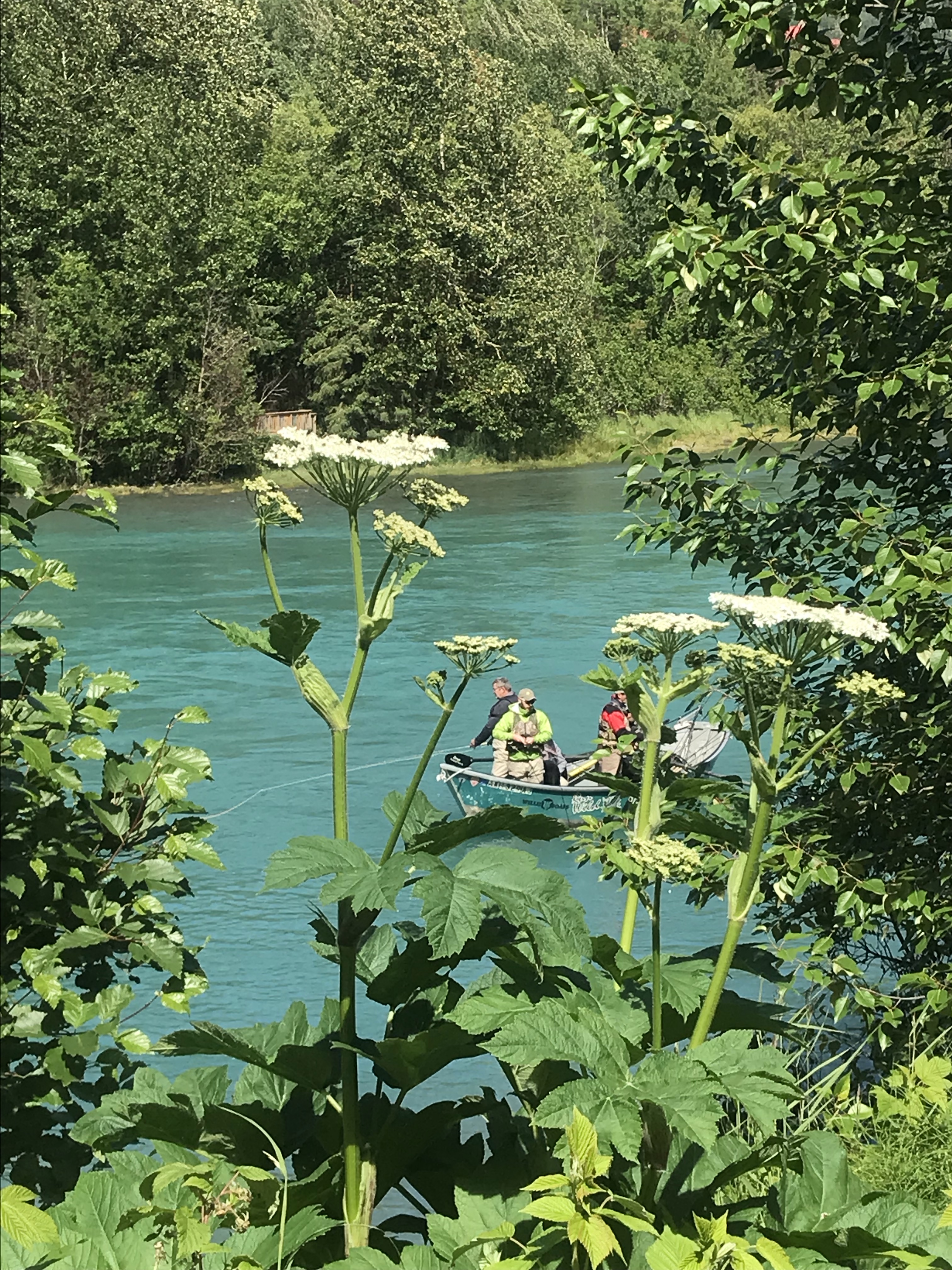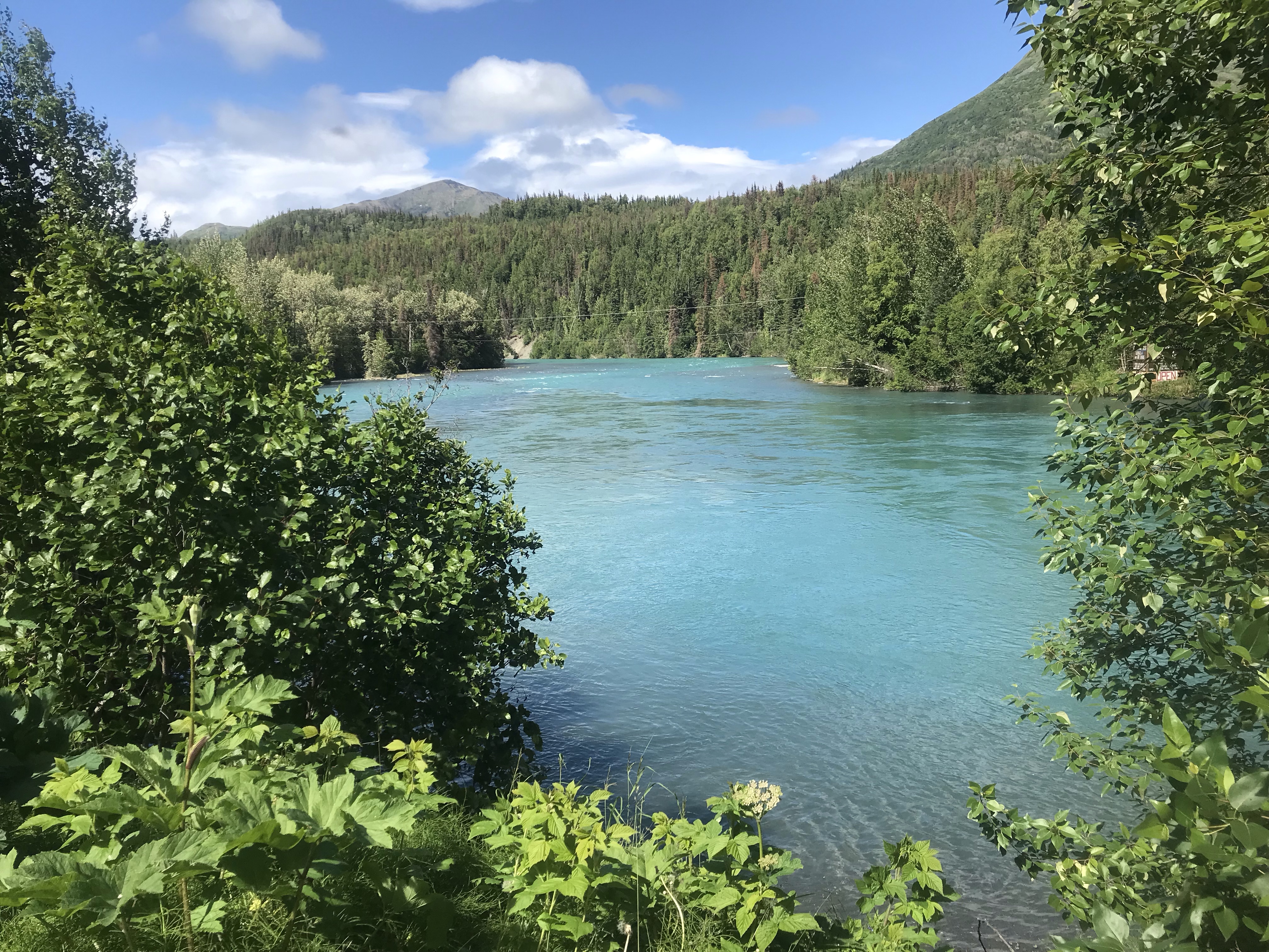 Rhonda and I continued on, now under mostly sunny skies, my mood vastly boosted. I finally stopped, tired of driving and hungry, at one of my favorite roadside pull-outs along the glistening Kenai River.
