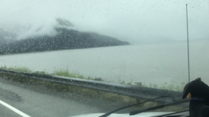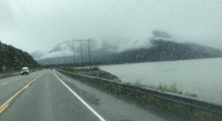 From my viewpoints along the highway, I could clearly see the collection of ominous dark clouds and sheets of rain obscuring the far end of the inlet. Oh boy, that looks like fun … not. Girdwood and Portage were obviously getting dumped on and I was heading right for it.