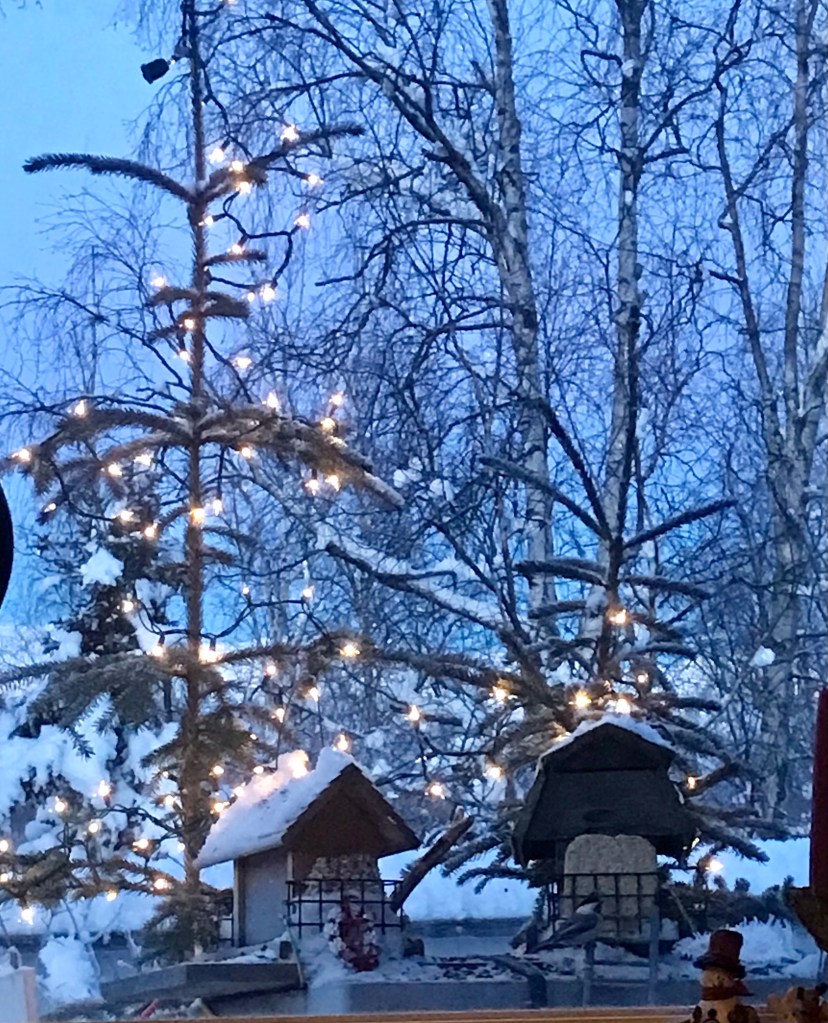 I watched, enamored by the dusk antics of a trio of chickadees, until the last of my winged friends darted away for the night … and watched on as the sky slowly darkened and the twinkling lights on my little deck scenario began to glimmer. It’s 5:00 pm.