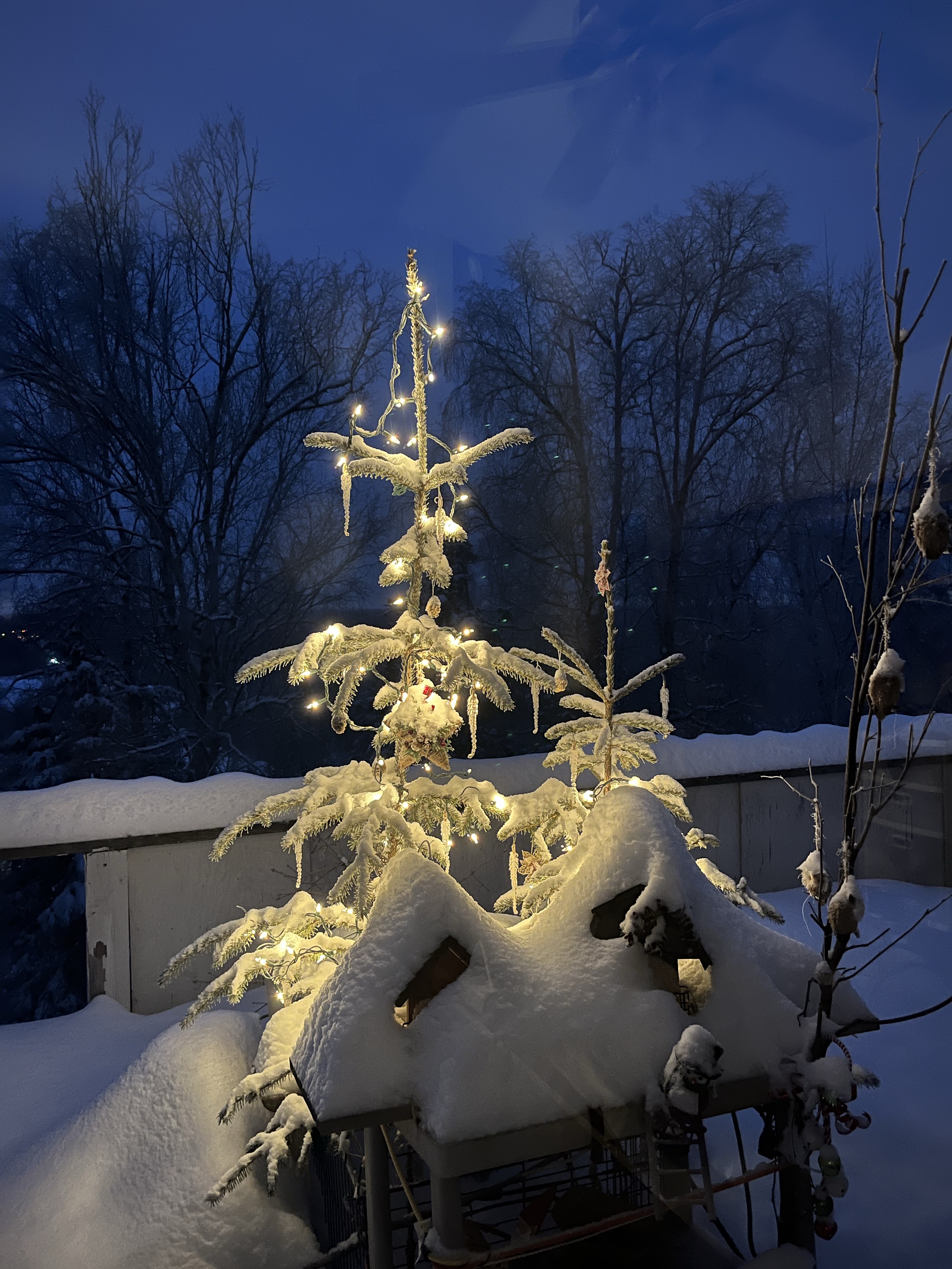 The snow stopped falling at some point during the night, giving way to stillness. I’m enjoying the pre-dawn vision of my little outdoor Christmas-decked bird-feeders in the total quiet of a landscape muffled by deep snow.