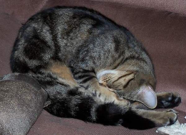 She rewarded his efforts with her own brand of affection; perching on his shoulder at mealtimes, paw ready to snake down to grab his spoon, sprawling across his arm while he was trying to type, or trotting up the stairs ahead of him, only to stretch full-length across the stairs, ready to trip him. This last token of love accidentally got her tail stepped on once or twice, but otherwise she and Jer both survived sixteen years of ongoing staircase sabotage.