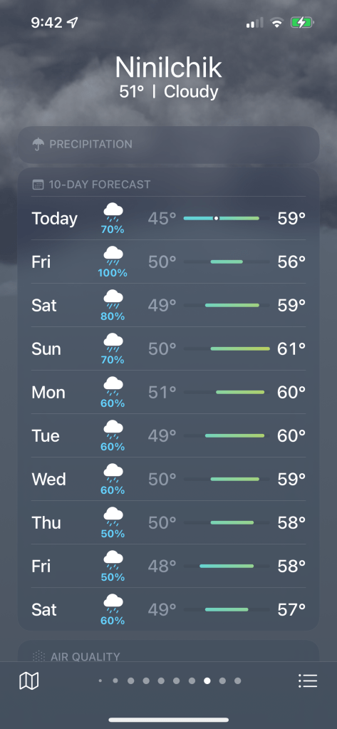 More determined than ever, I drove on. My weather apps all indicated warmer temperatures and no rain … if I could just drive far enough north.