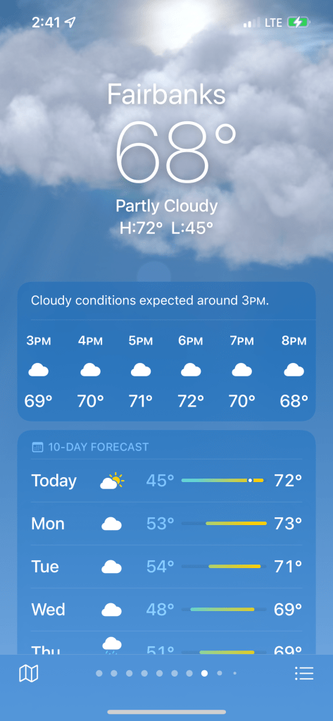 At this point, I knew the foothills of the Alaska Range were in the distance and would normally be a lovely sight about now, but I might as well have been in “Anywhere, USA”. Dark clouds obscured any glimpse of mountains.