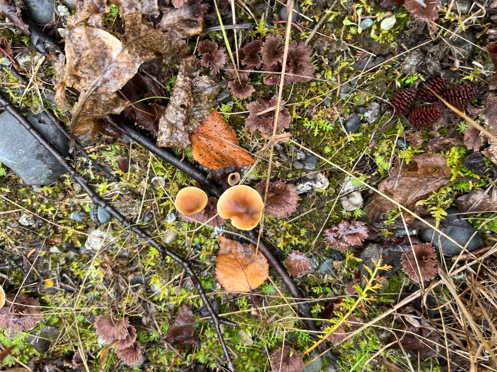 Another mushroom currently plentiful in our yard and along the driveway are the easy to miss (and also toxic) Rufous Milkcap, a species of milk-caps (Lactarius). Their tan and brown shading and relatively small size camouflage them nicely until you know what to look for.