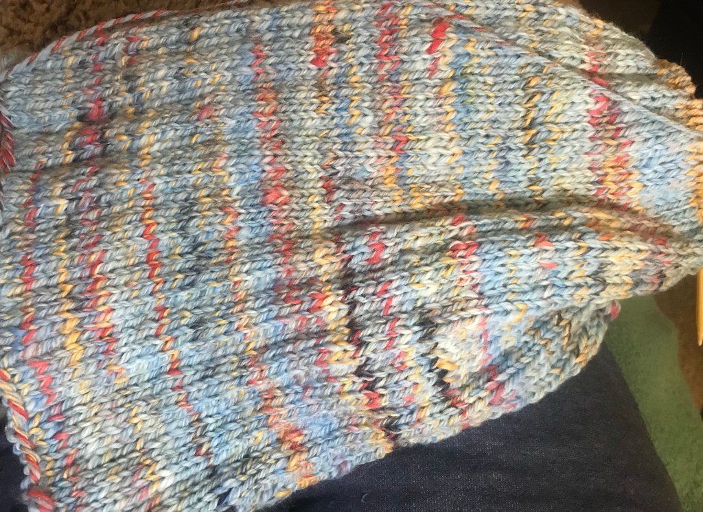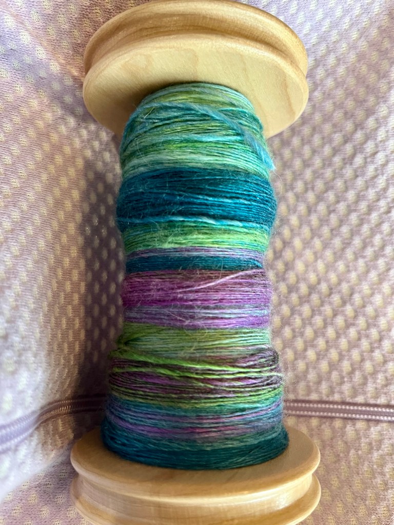 So, I found this pretty, multi-colored blue/green/purple on one bobbin. I think it was leftover from a large project several years ago. I don’t have any more of the hand-dyed merino wool I originally spun this single from, so I need to come up with an alternate plan.