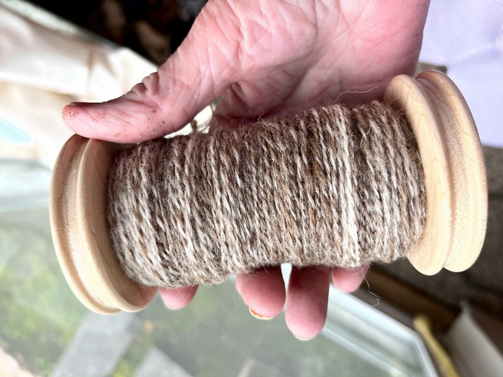 Progress! I found a bobbin half full of a cream-color wool. Plied together with the brown wool, it created a nice brown and cream 2-ply. Another two bobbins cleared!