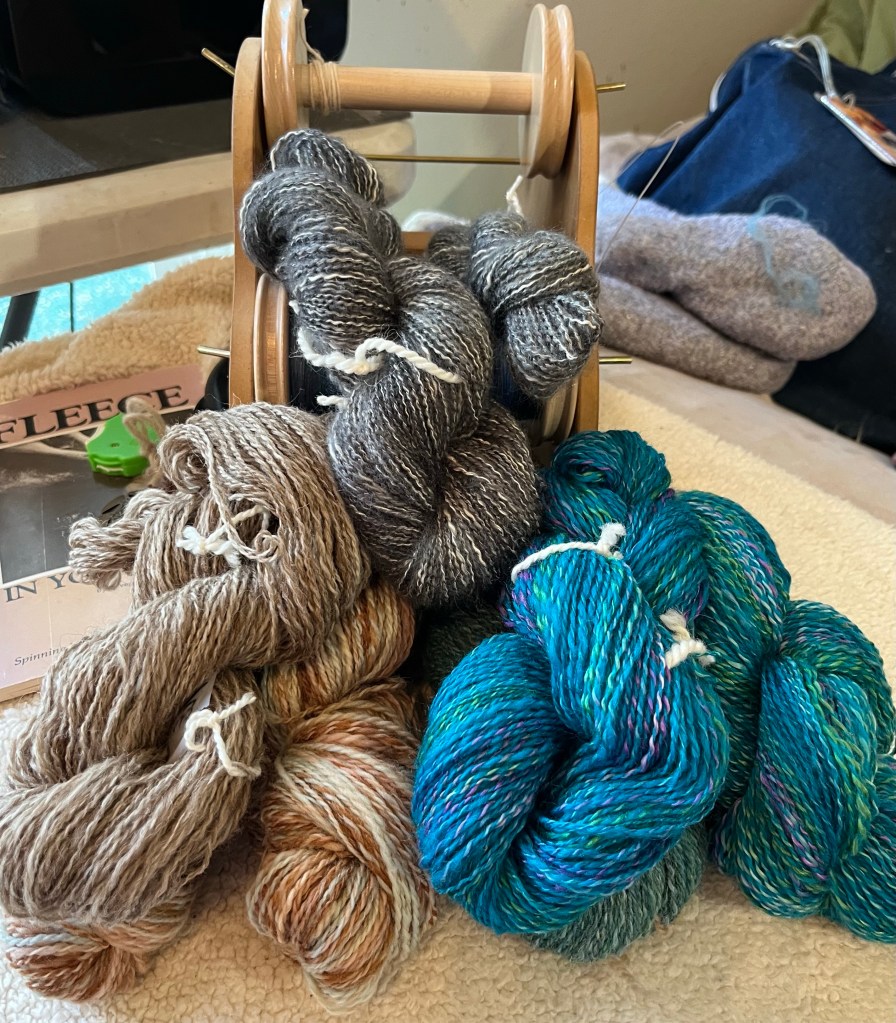 Now, if you know me, you should know I’ve often got more than one project going at the same time, be it multiple small samples spins, single-color spins I’m thinking about plying together (and sometimes end up not using) or maybe I have a desire to spin up a brilliantly dyed, multi-colored roving as a visual break from spinning a large project’s worth of some natural cream or brown fiber. Etc.