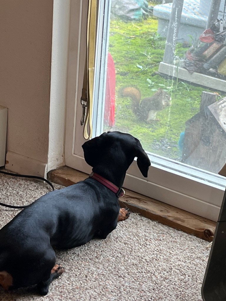I guess that’s partly why I not only allow, but encourage and enable Rhonda in her daily bouts of squirrel hunting. 🐿 It’s not likely she’ll ever catch this particular furry prey, since the squirrel is fast and Ronni is limited by a 6’ leash, but she has come close enough times to keep the game entertaining – and it keeps the squirrel on its toes.