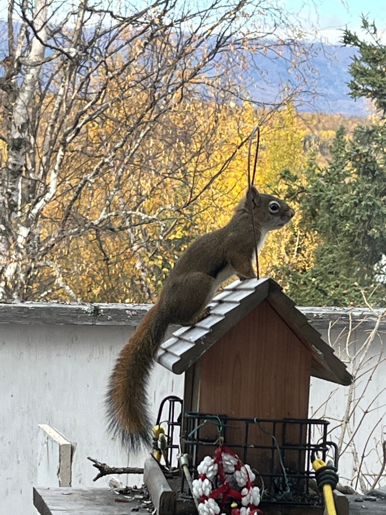 Our squirrel is a bit of a bully, and while I don’t mind feeding him, I don’t like it when he actively chases the birds off the feeders.