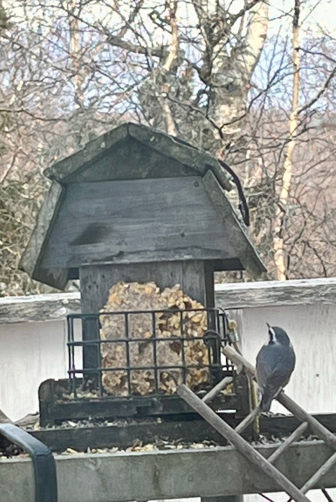 Nuthatches are one of my favorite bird-feeder visitors partly due to their sheer tenacity. Such small but bossy tyrants; they zoom in while I’m filling the feeders, scolding as they supervise, wings whirring – impatient for me to be out of their way.
