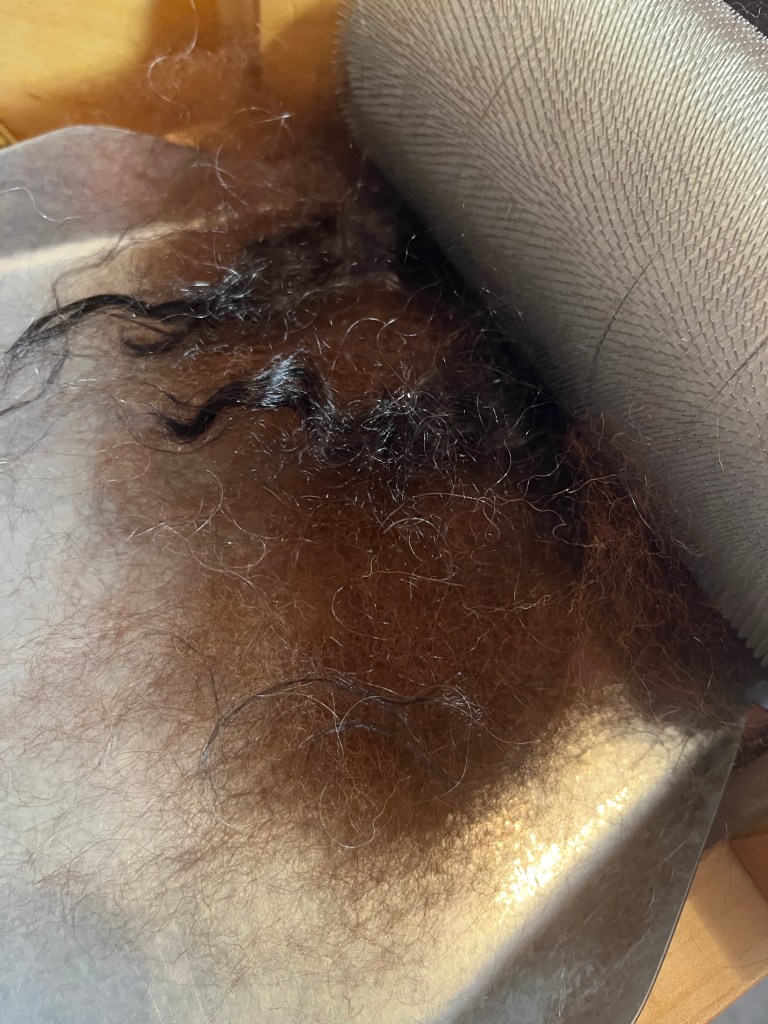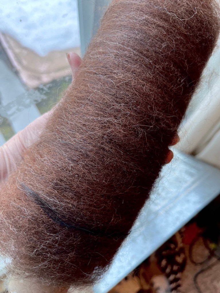 My eyes settled on a bag of Pygora roving. Dark brown, almost but not quite expresso. Lovely and fine – and now I’m thinking I might use less of the Mohair.