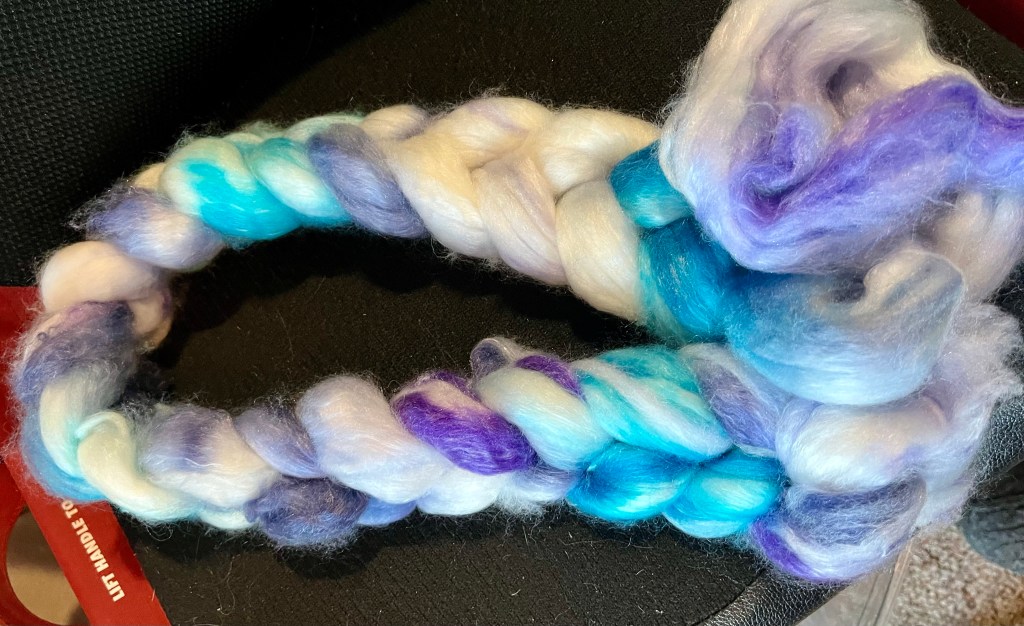 So, when I found this blended braid hanging in a vender’s booth at the retreat, the soft feel of it and the lovely colors spoke to me. I’m glad it did.