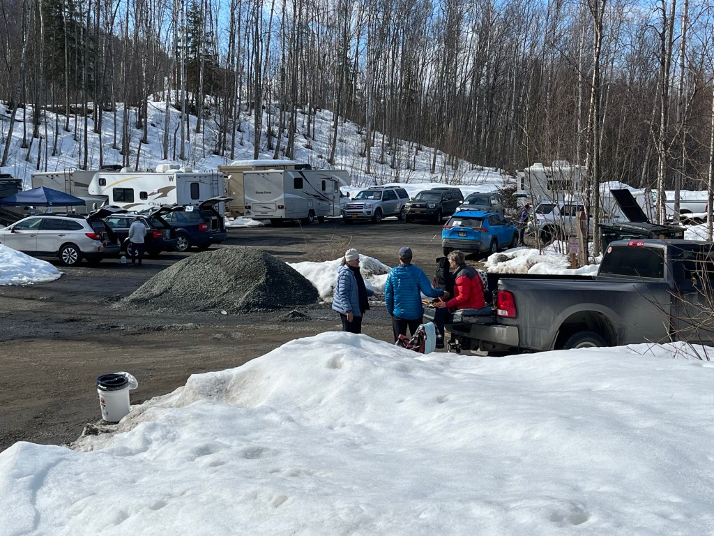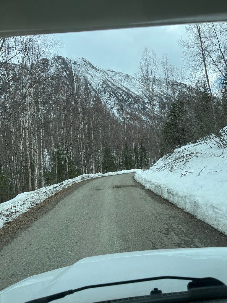 With a lot less sunshine falling on the deep snow, Spring has been slow to come to Chugiak. I was immediately surrounded by receding but still substantial roadside snow banks. This was the gravel road I followed up the mountain to Camp Gorsuch.