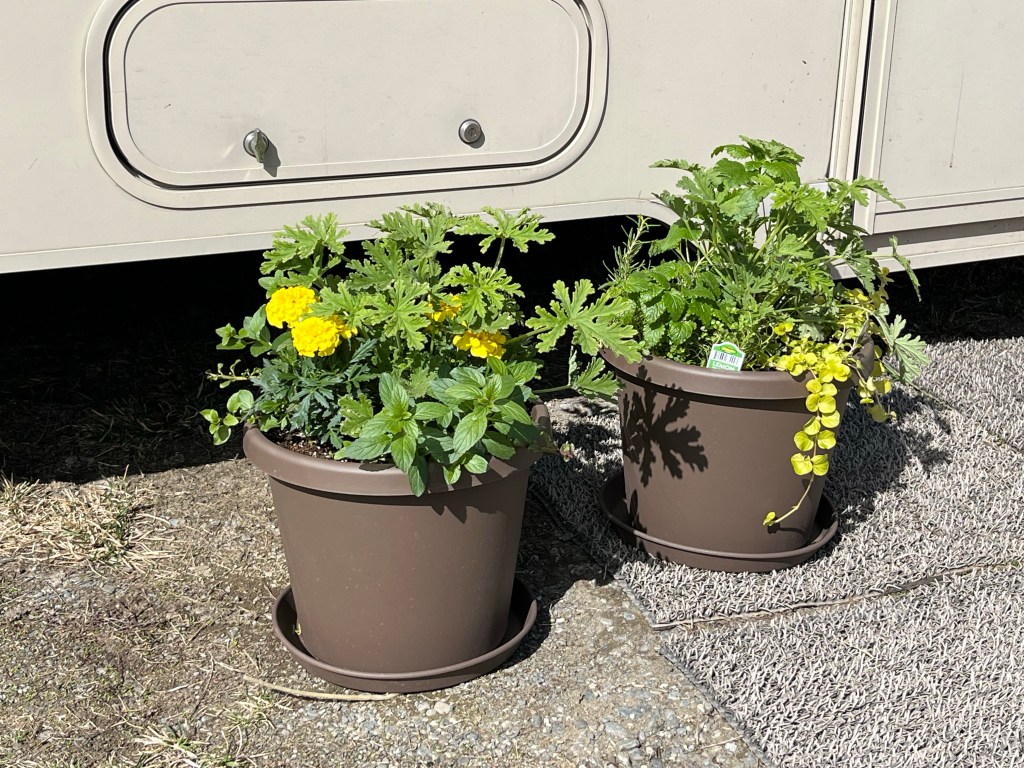 I also chose new pots this year, meant to complement the tan and brown shades of my RV exterior. Of course, it’ll look nicer when I have the pots sitting on my big blue and tan washable ground cover.