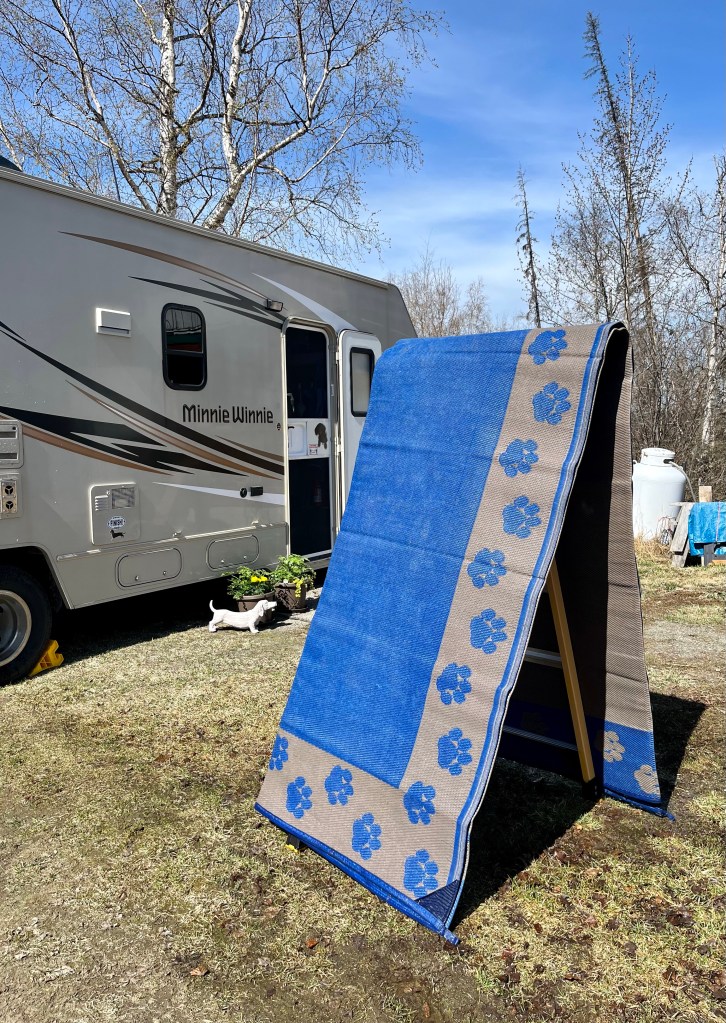 Oh! The area mat! The one that was helping keep the mud and dirt out of Roada during those cold, wet trials! Geez, I almost forgot – I rolled it up and stored it away, wet and muddy. It needs washing! [Envision me pulling my big plastic-woven ground cover out of the RV garage and hefting it up over a ladder in the yard.]
