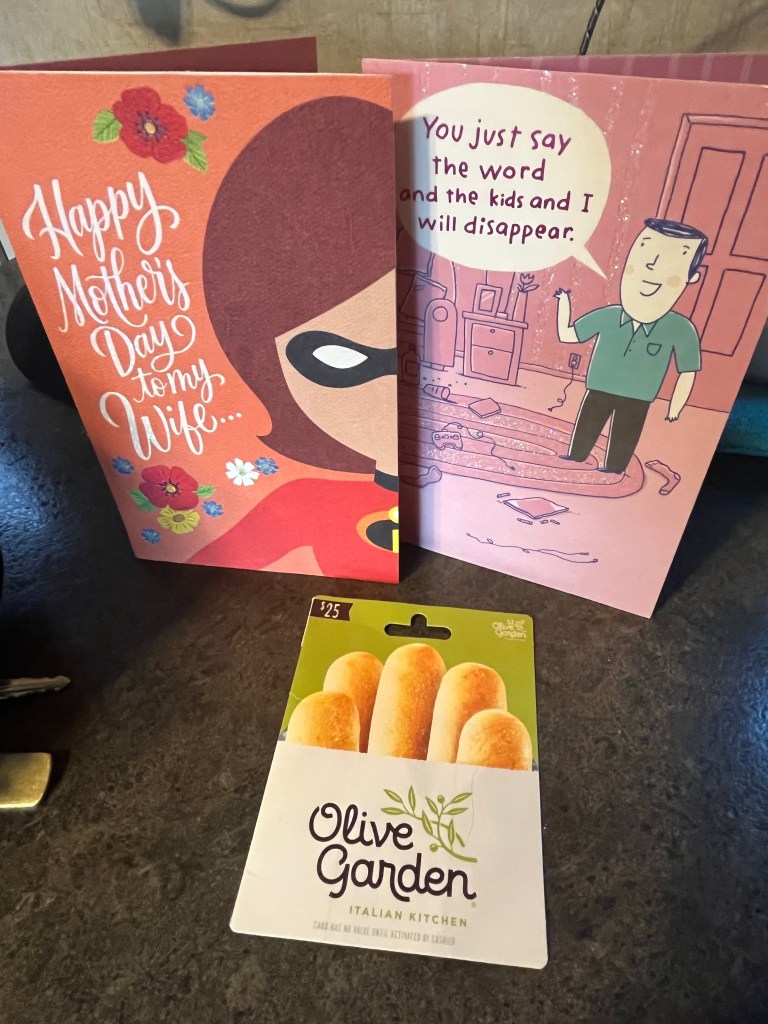 Olive Garden! 🥗🍤 View from our private dining room at the far end of the parking lot.Mother’s Day cards from Jer and the pups, and an Olive Garden gift card!